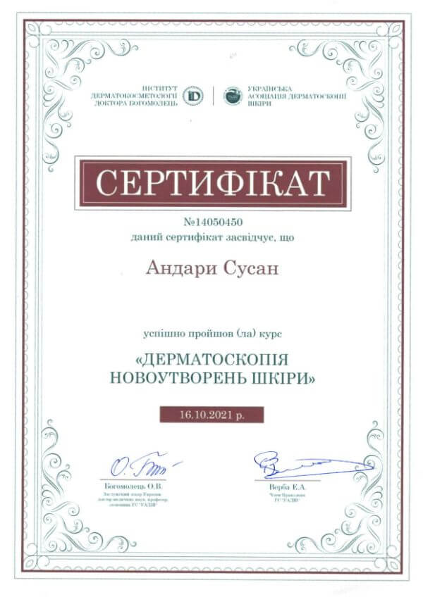 • Приватний вищий навчальний заклад «Київський медичний університет», спеціальність «Дерматовенерологія», 2022