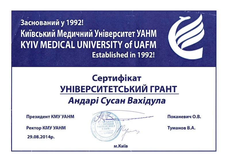 • Приватний вищий навчальний заклад «Київський медичний університет», спеціальність «Лікувальна справа», 2020