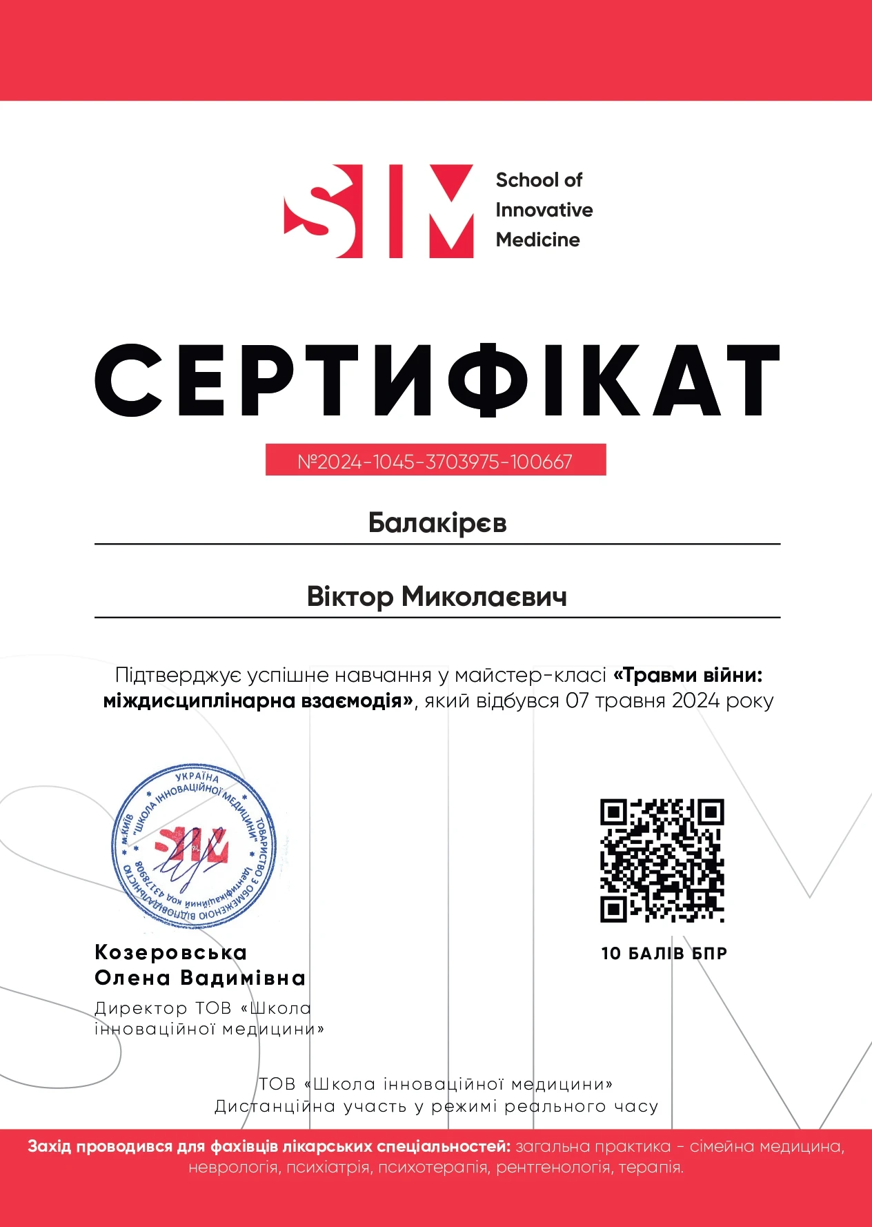 - Національна медична академія післядипломної освіти імені П.Л. Шупика, спеціальність «Психіатрія», 2000