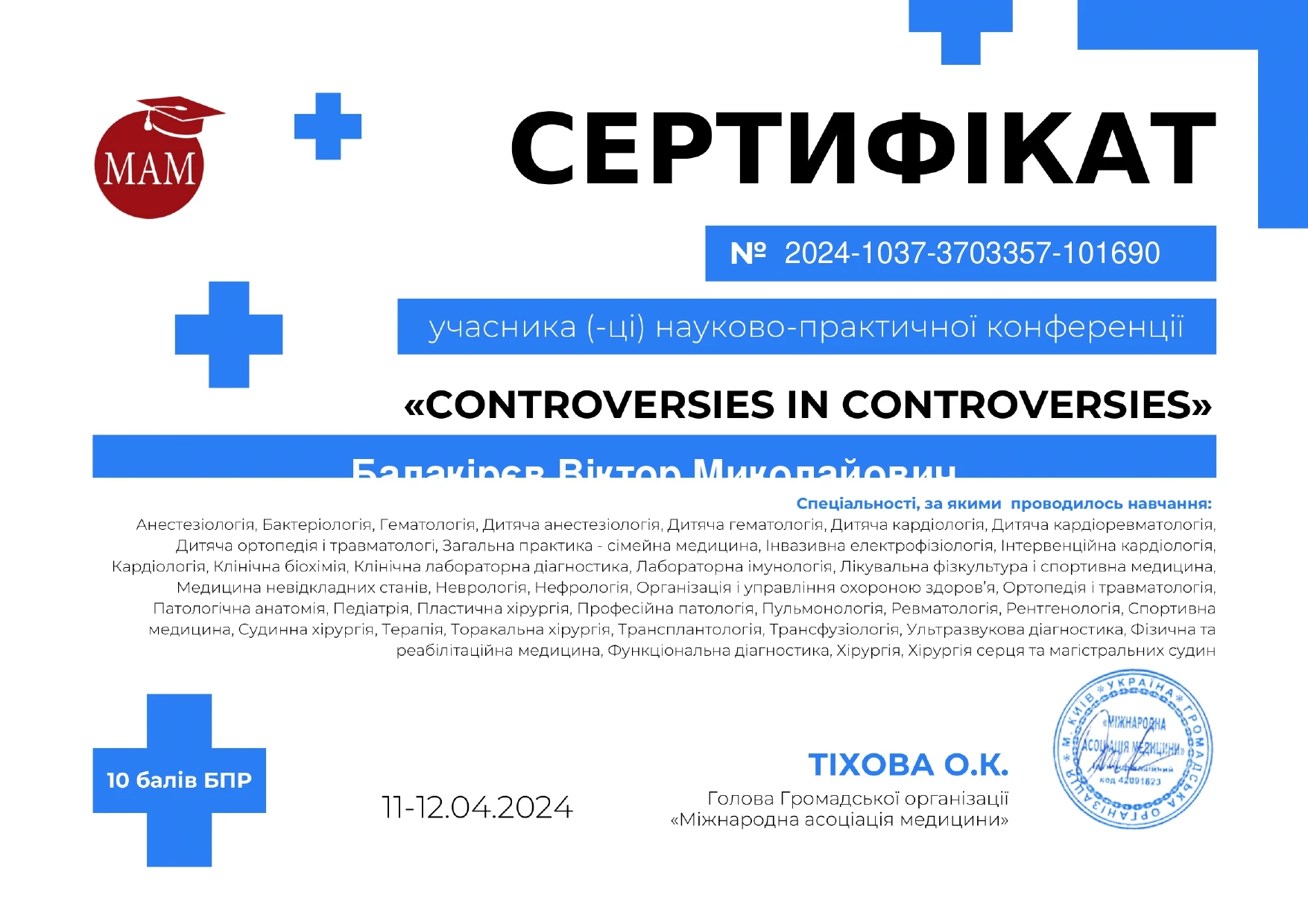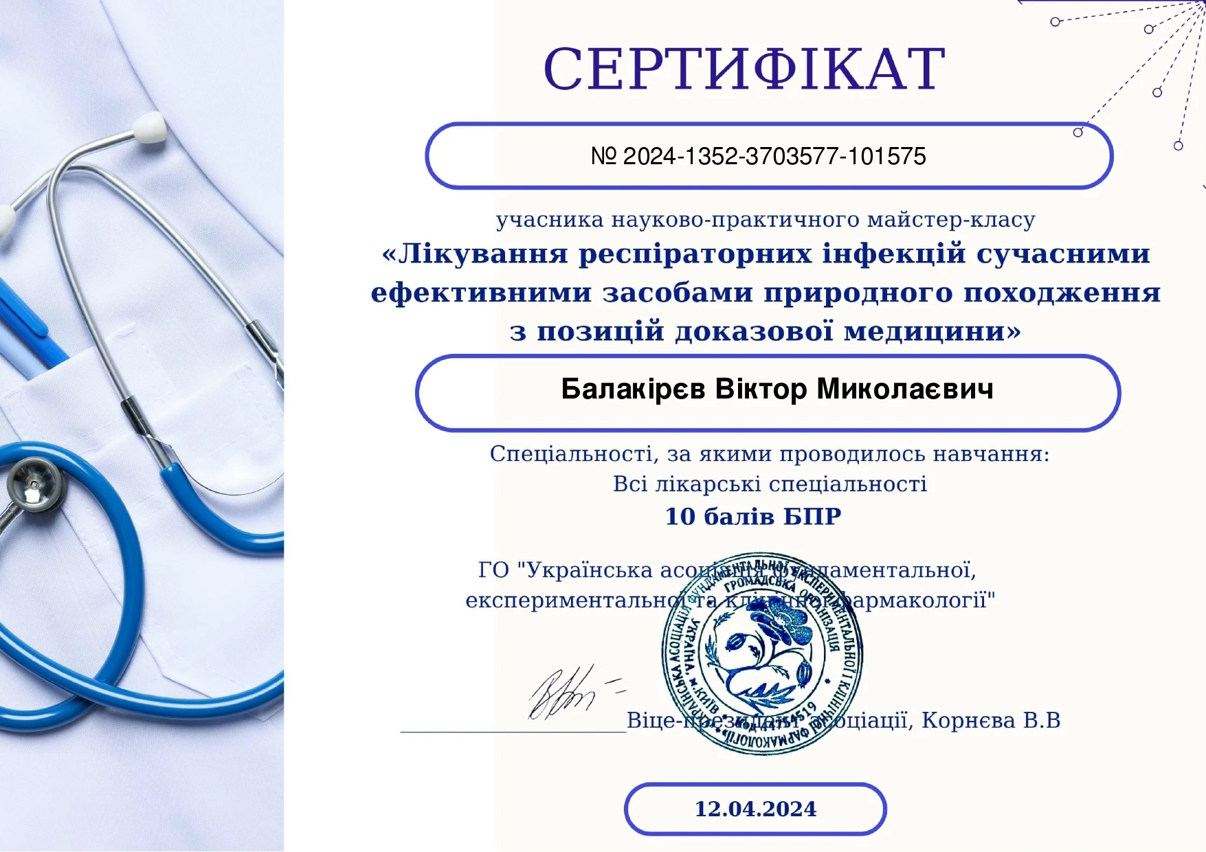 - Харківська медична академія післядипломної освіти, спеціалізація «Наркологія», 2001
