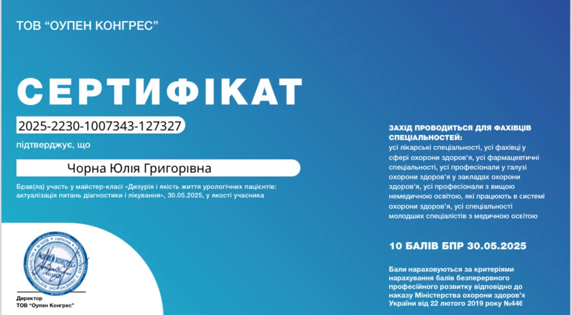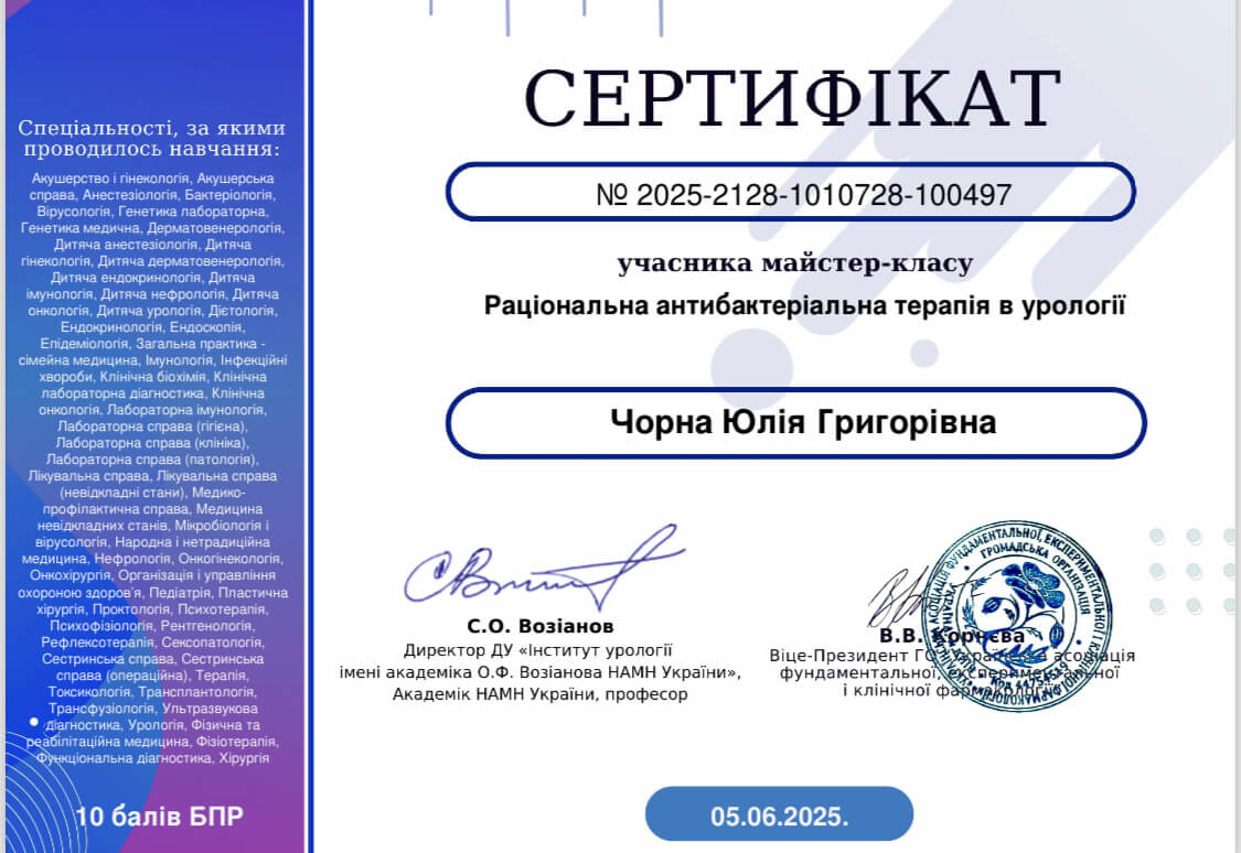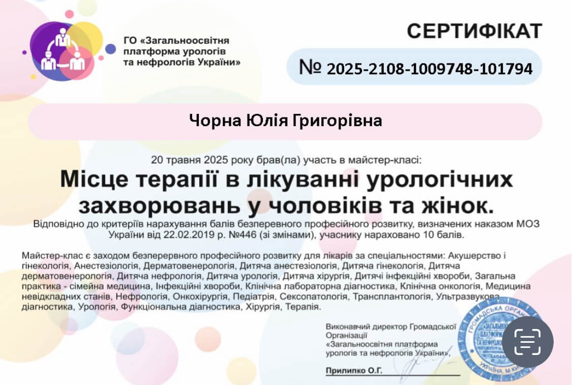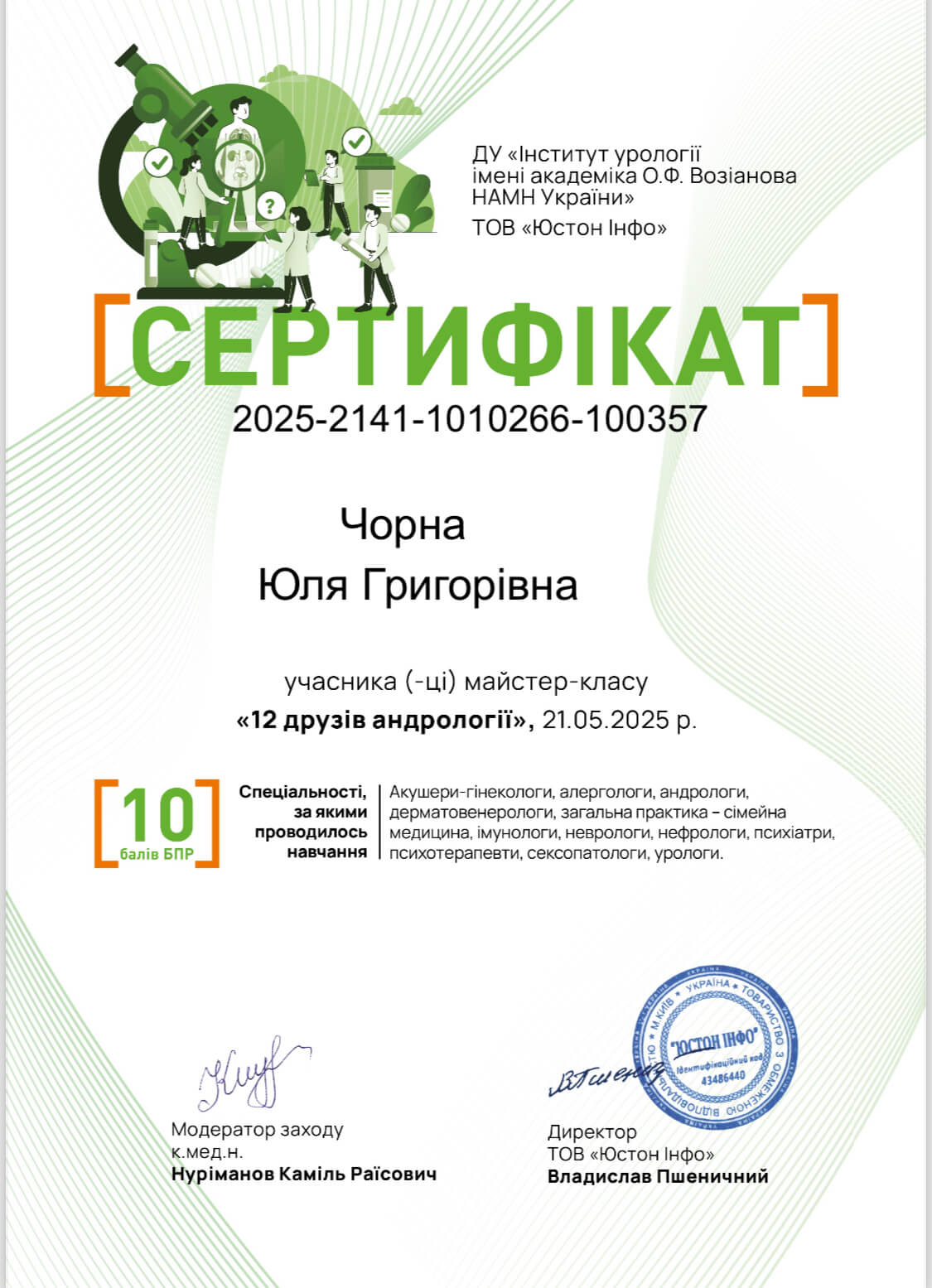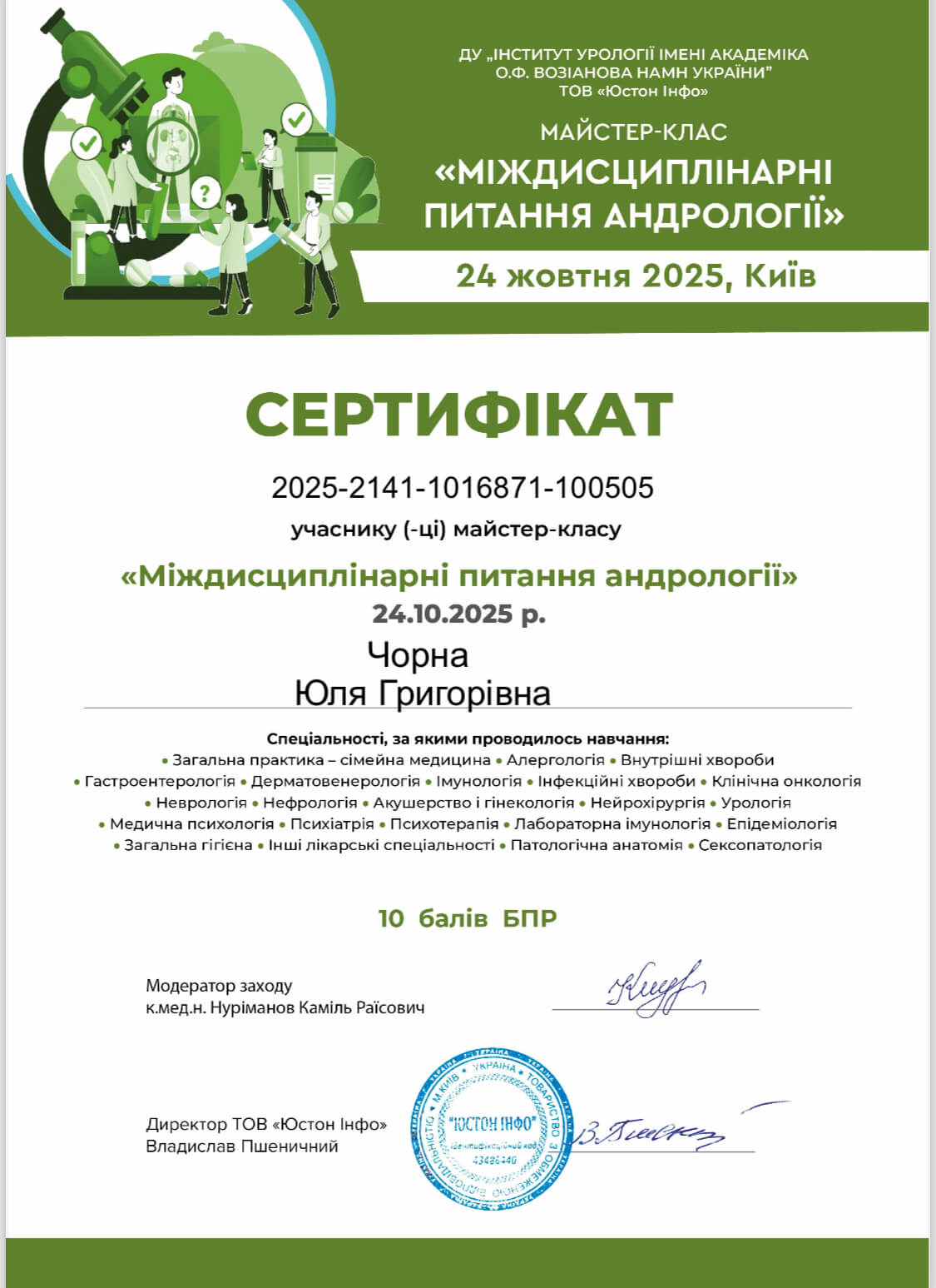 Лікар-уролог Чорна Юлія Григорівна, чудовий лікар!!! Допомогла з проблемою, дякую!!!