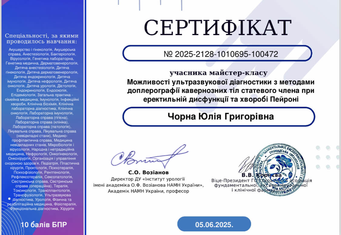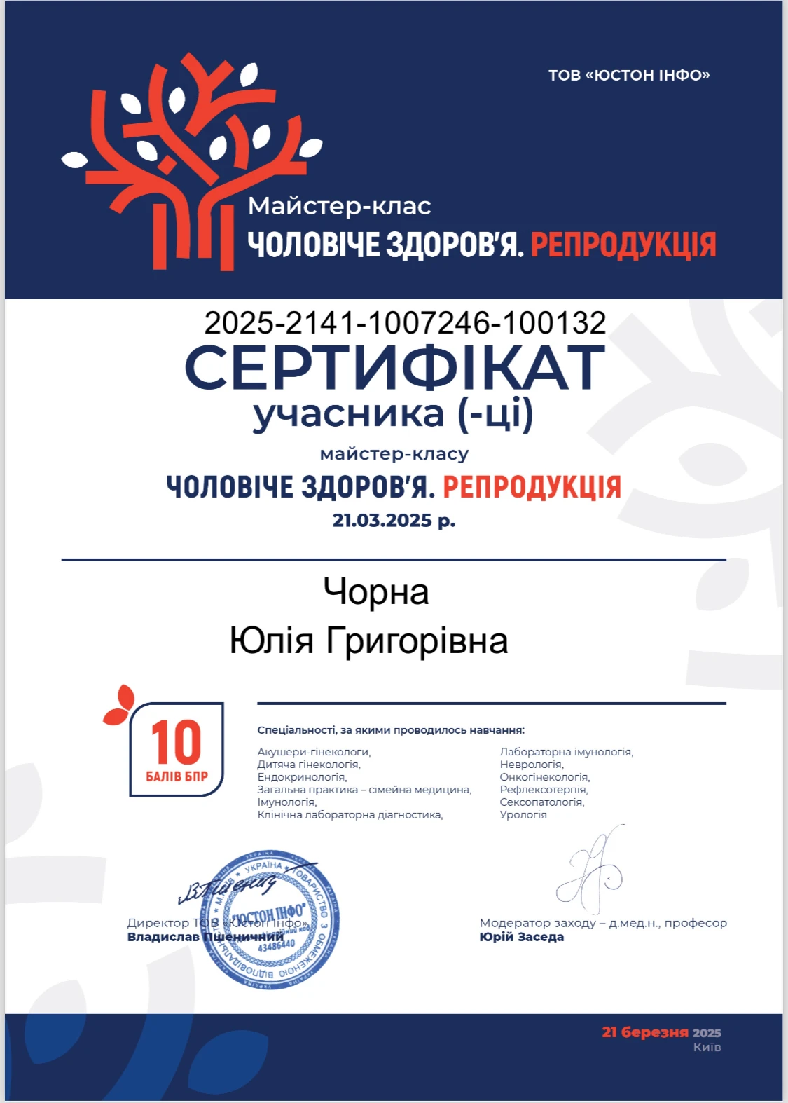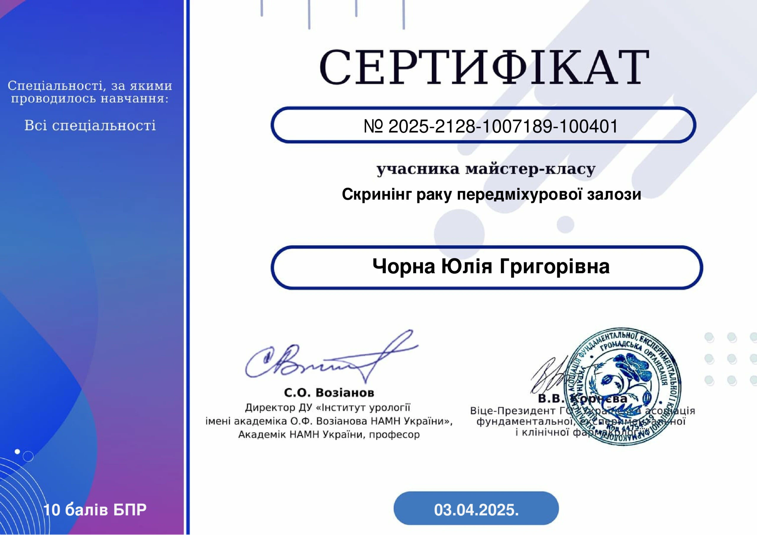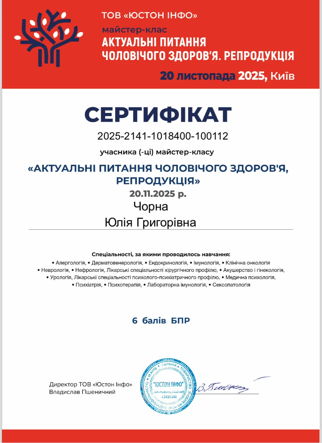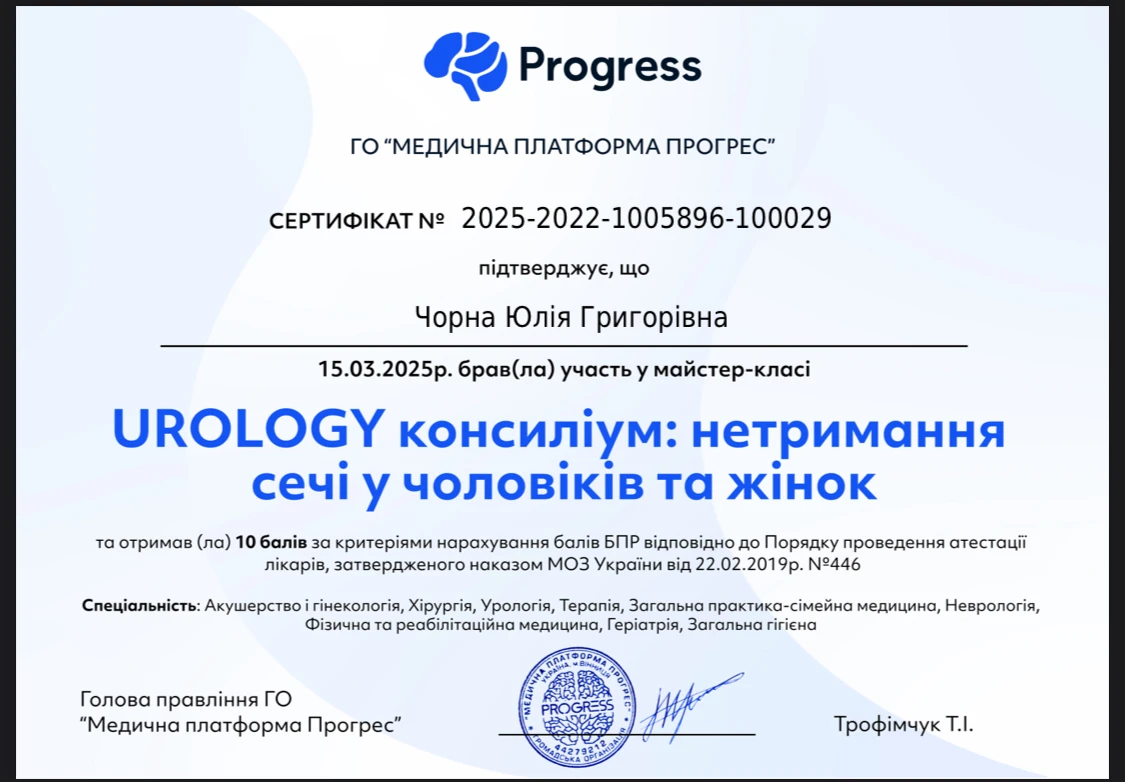 Лікар-уролог Чорна Юлія Григорівна, чудовий лікар!!! Допомогла з проблемою, дякую!!!