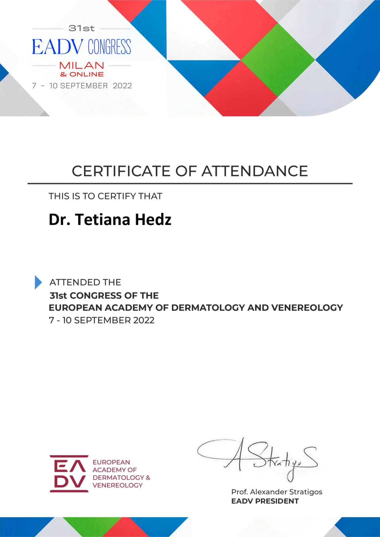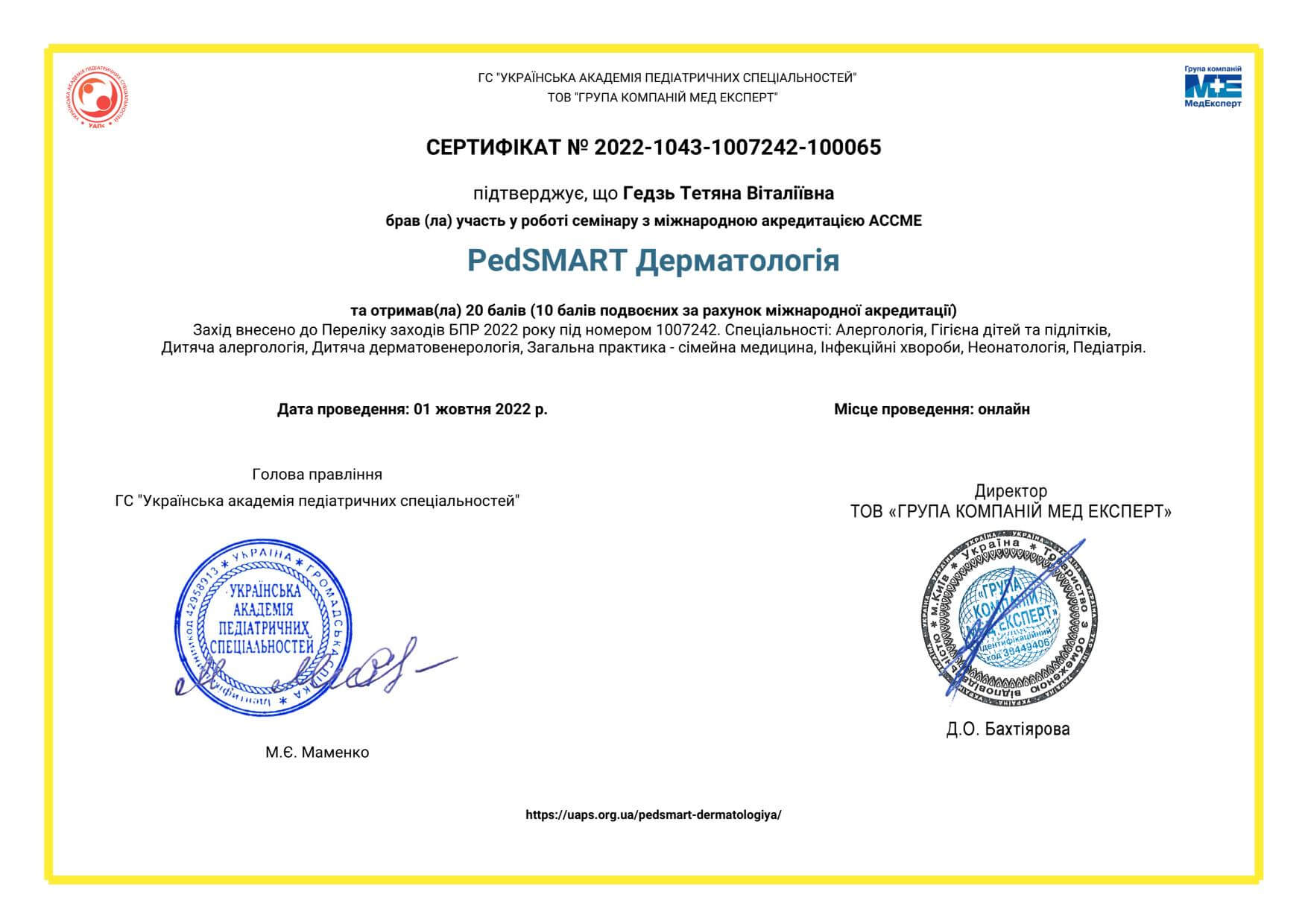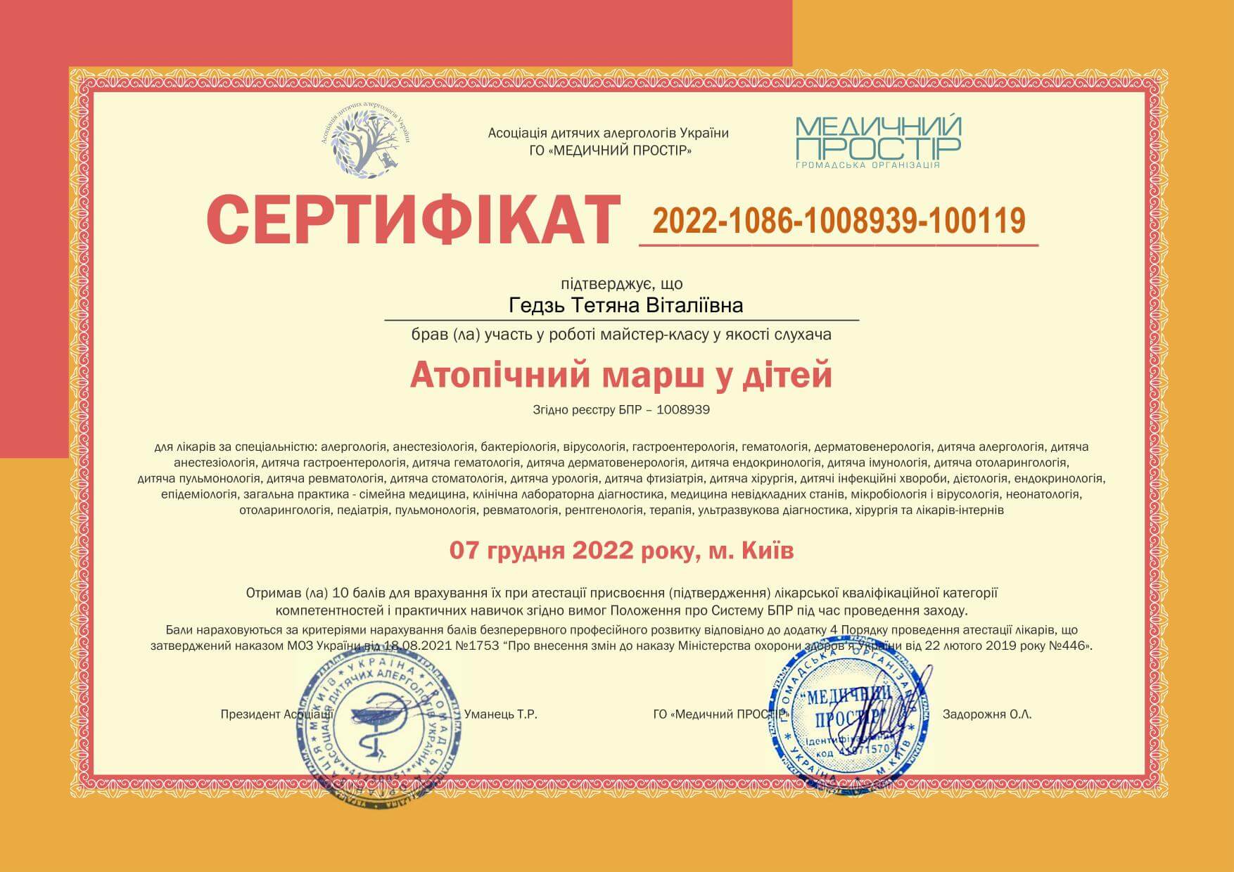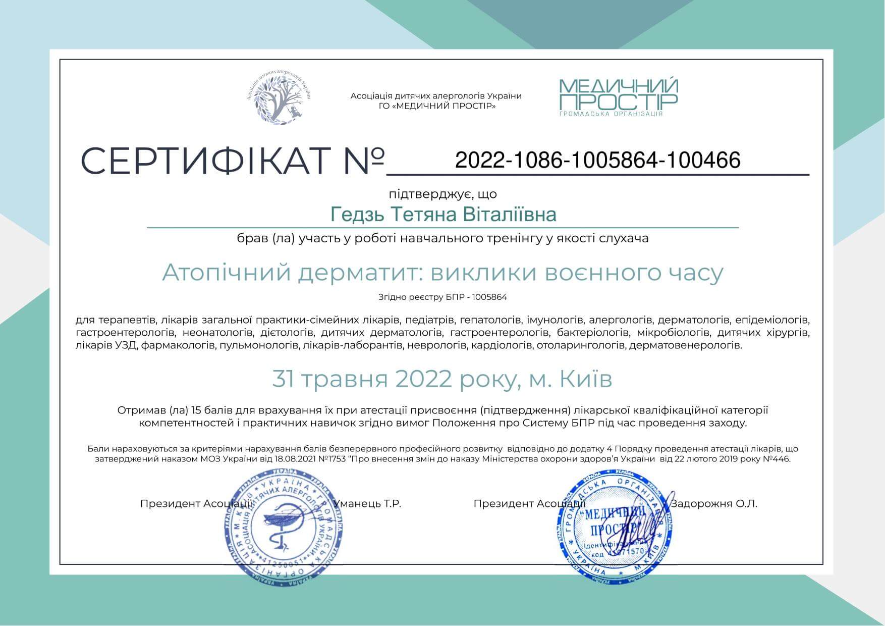 • Національна медична академія післядипломної освіти імені П.Л. Шупика, спеціалізація «Дитяча дерматовенерологія», 2017