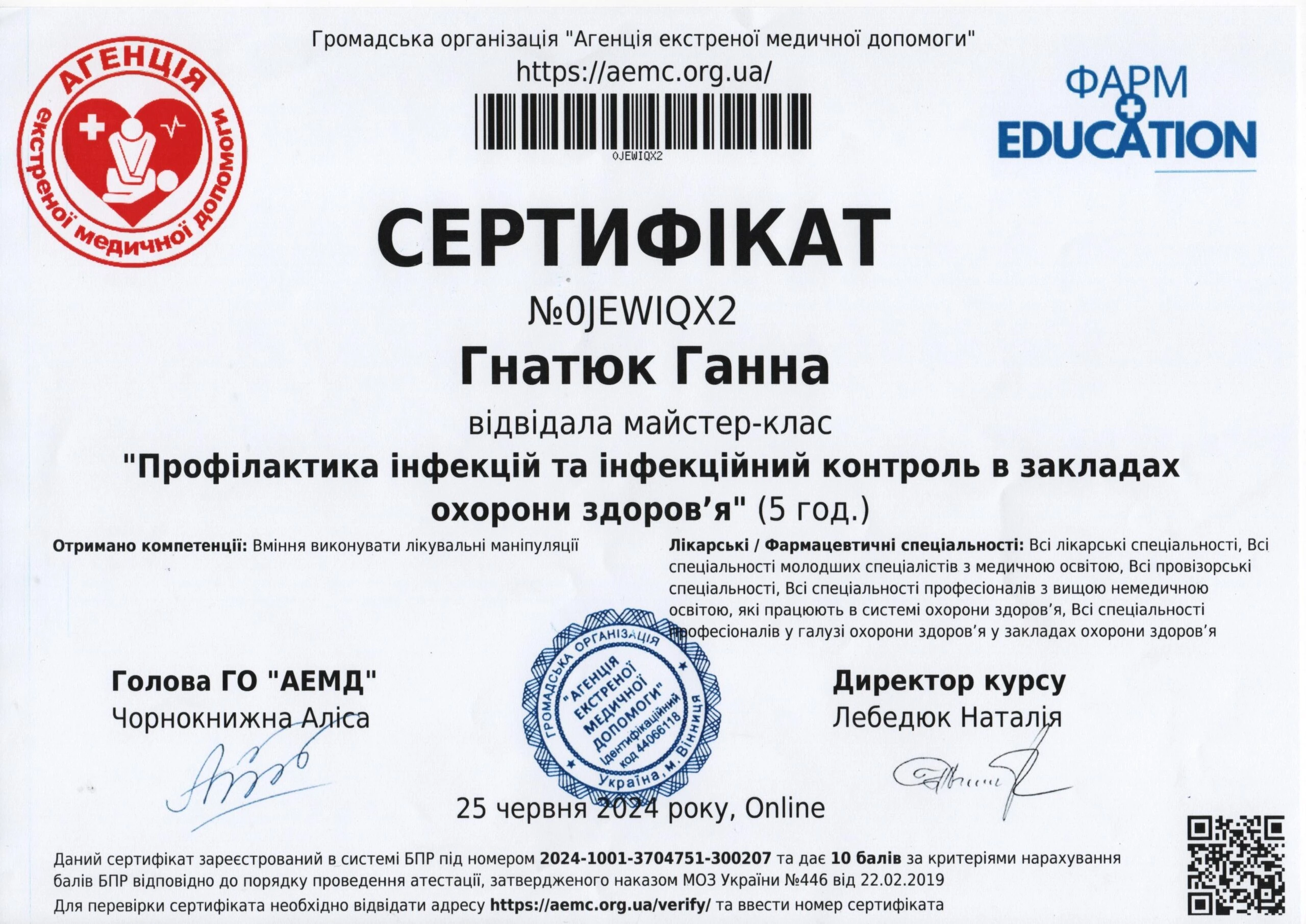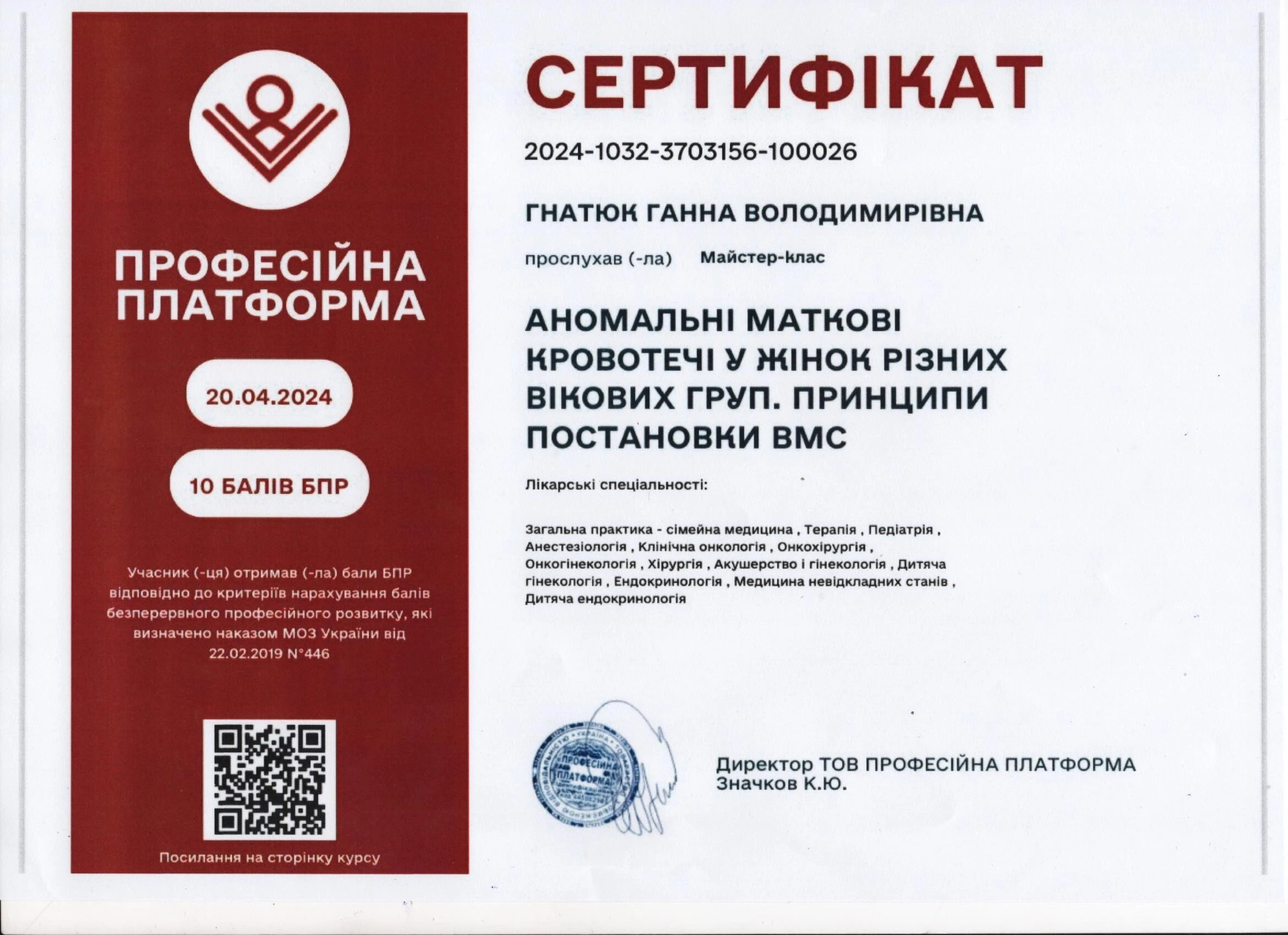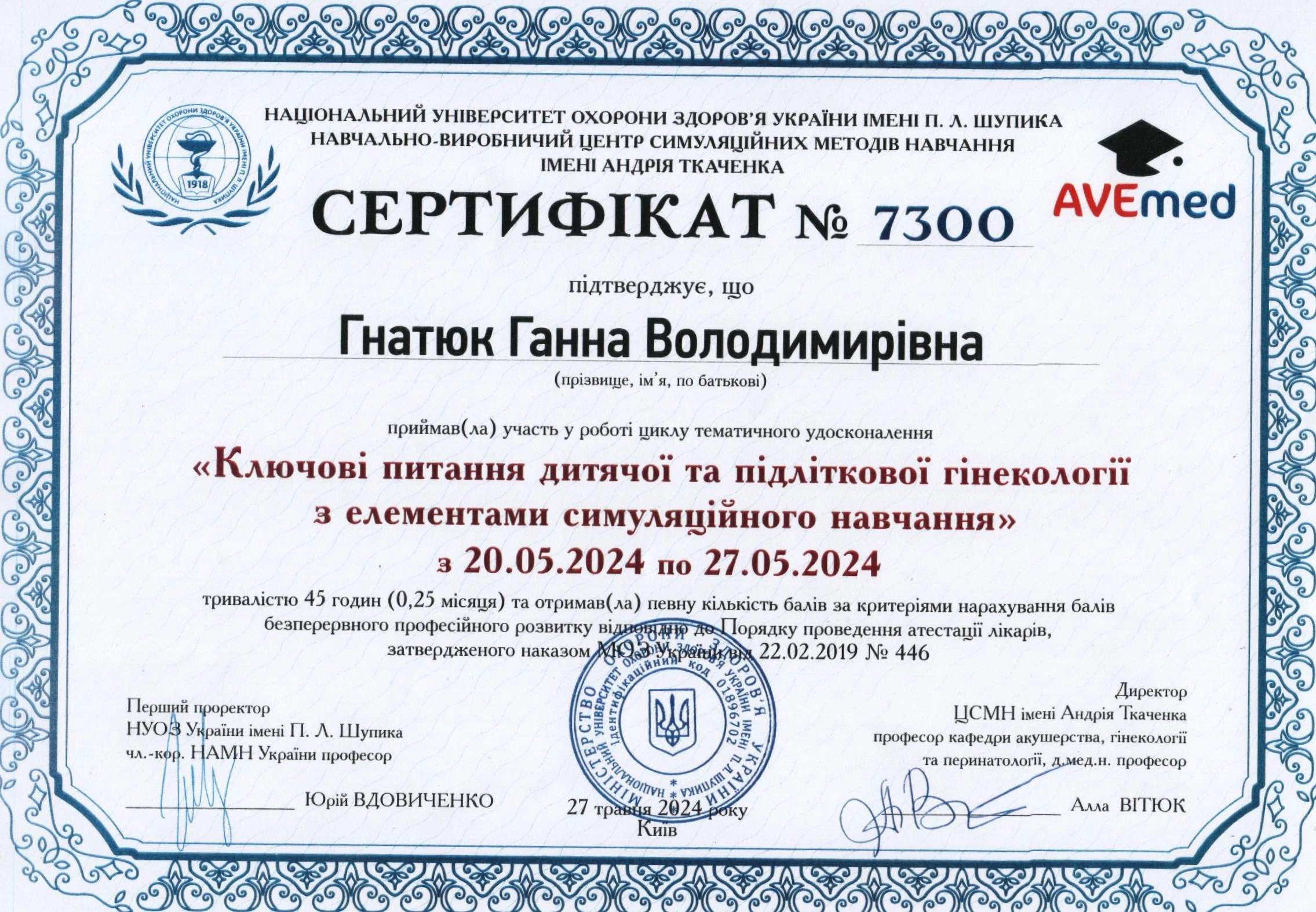 - Тематичне удосконалення «Ключові питання дитячої та підліткової гінекології з елементами симуляційного навчання», 2024
