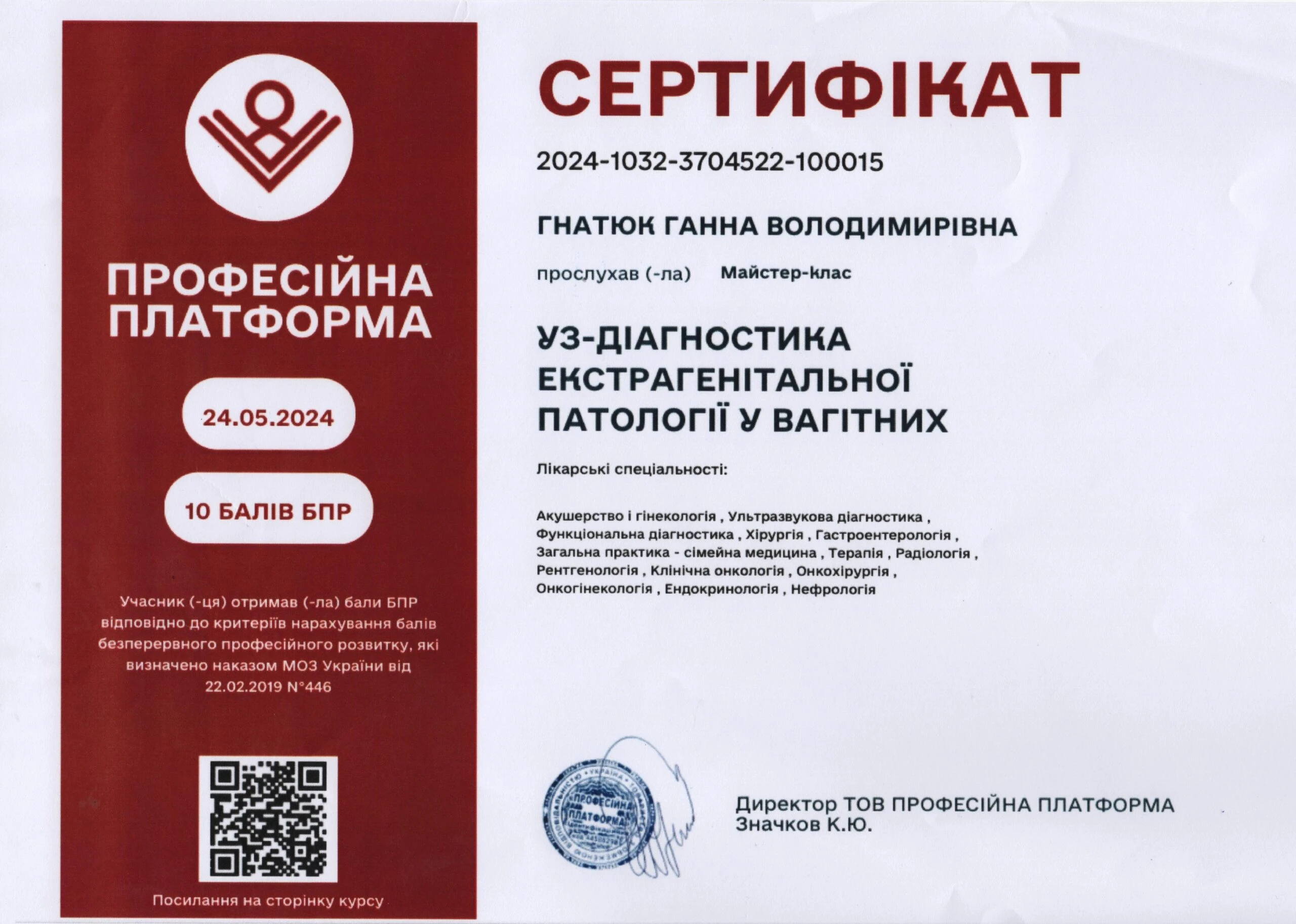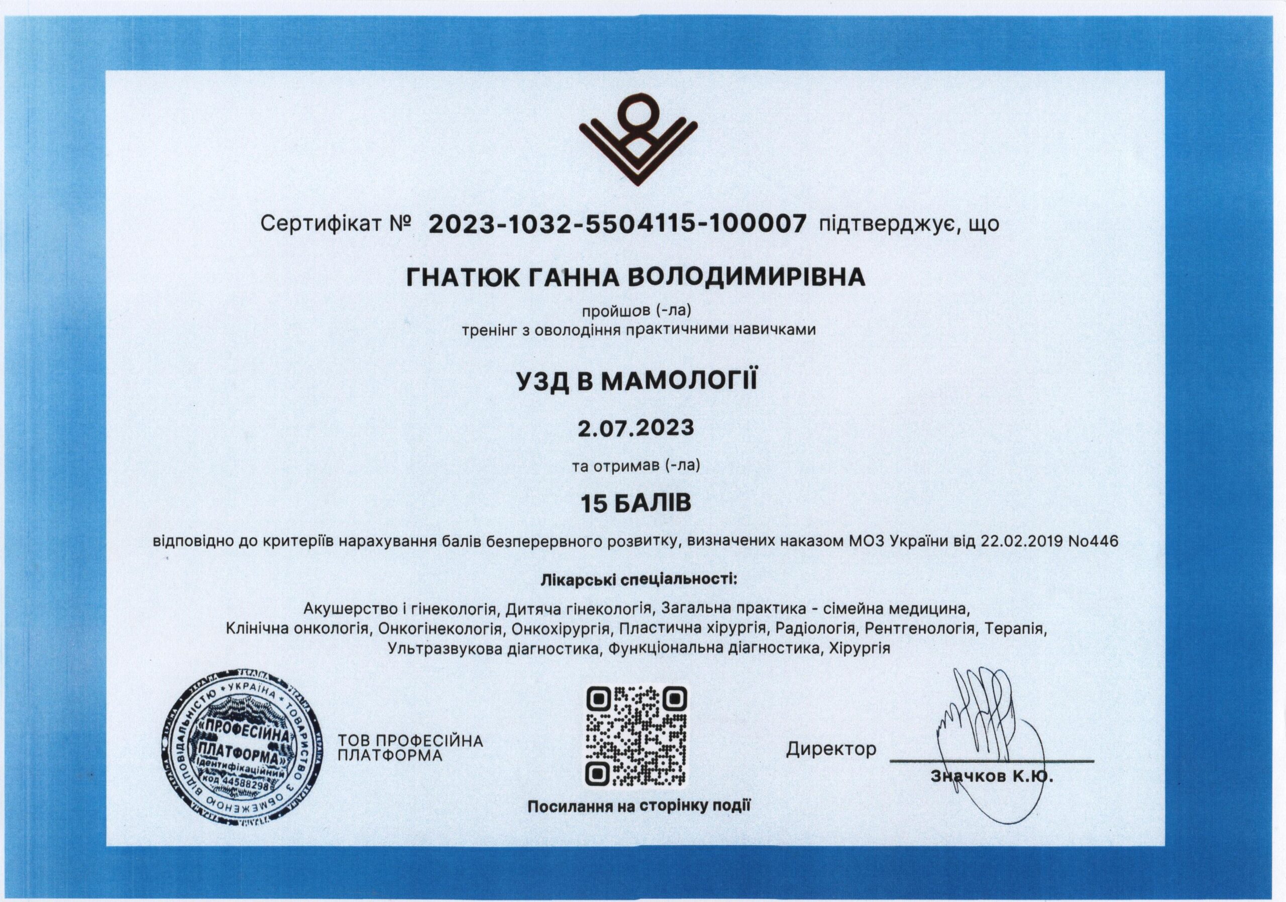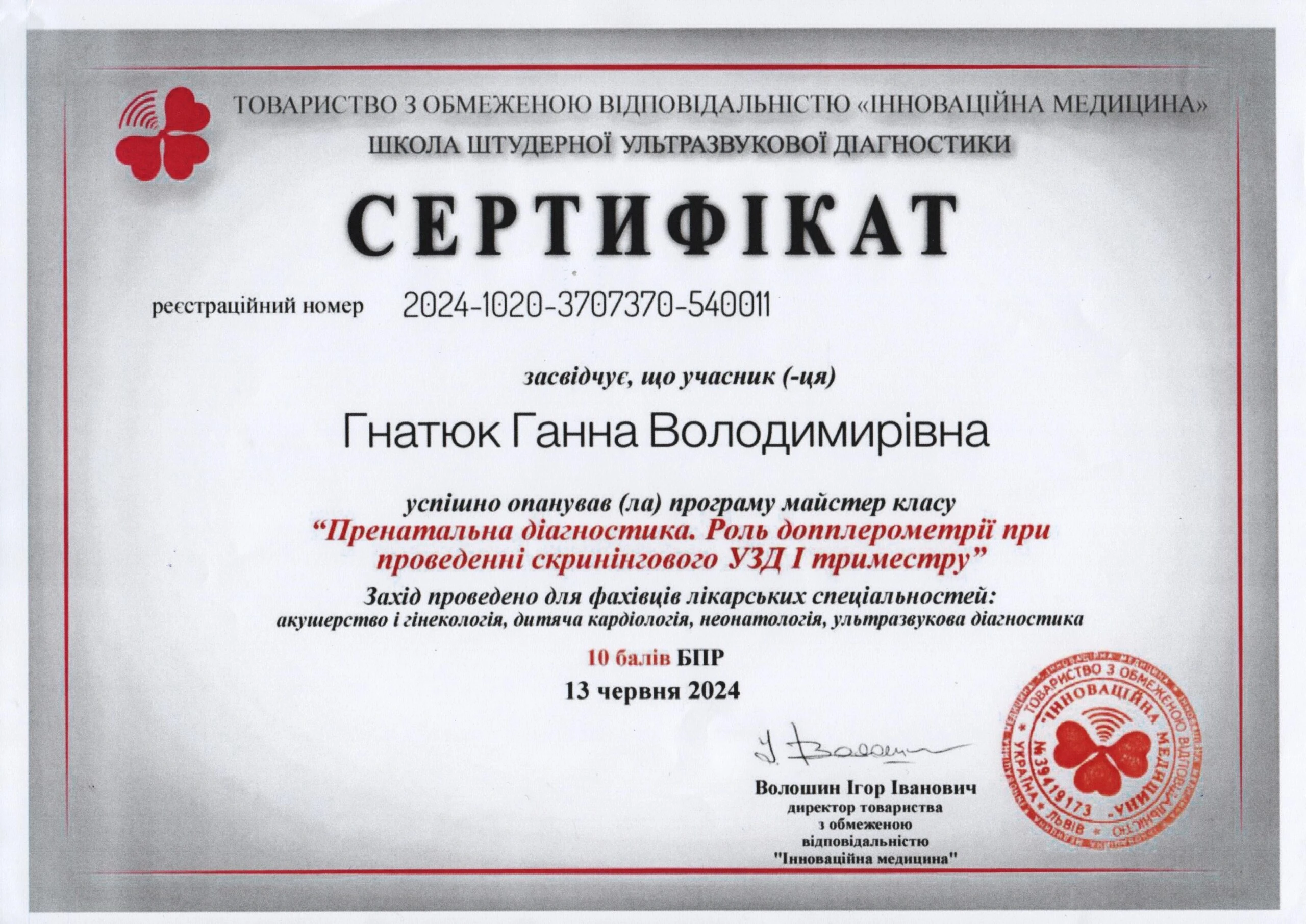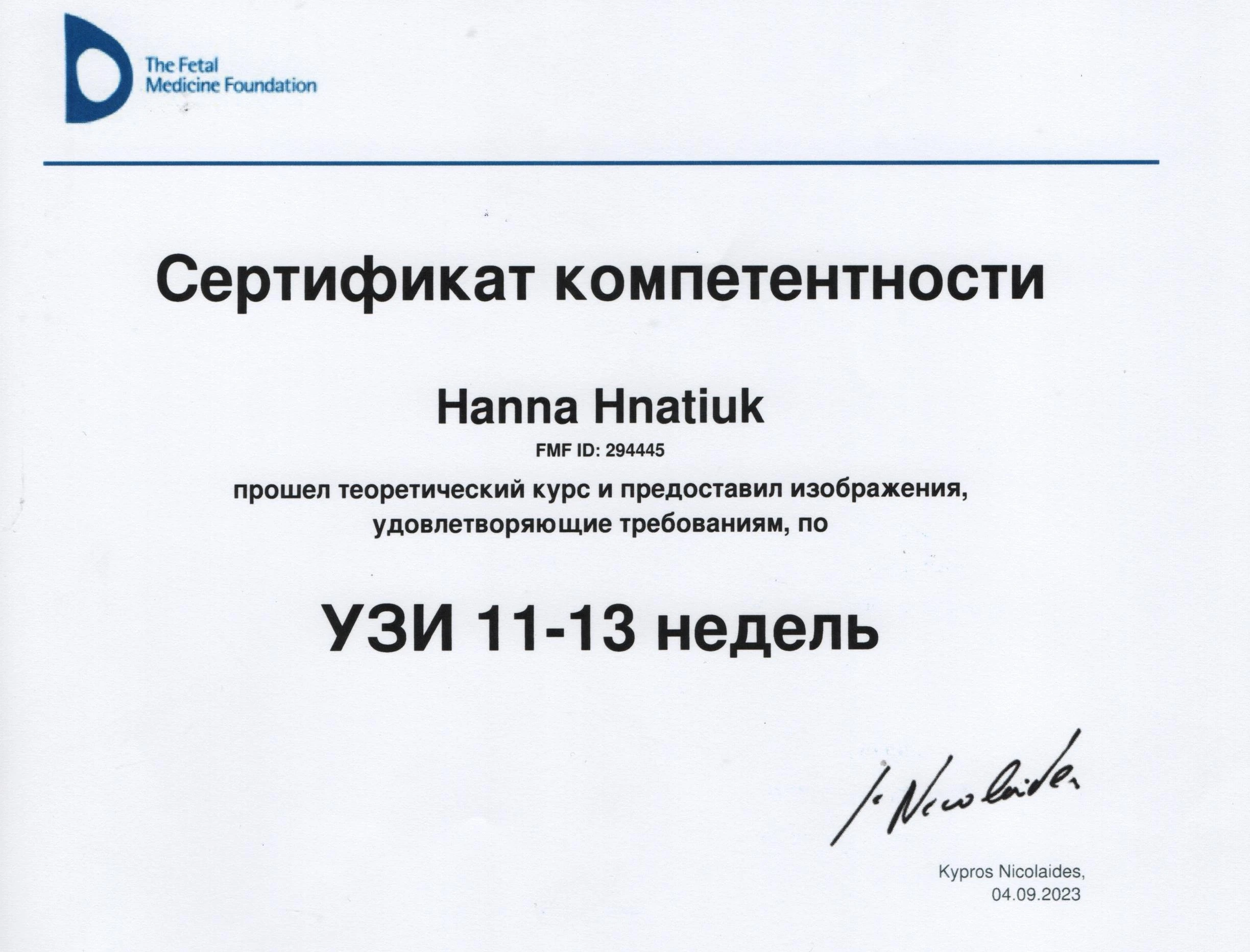 - Сертифікація (пренатальний скринінг) — FMF ID 294445 (повне ліцензування — комірцевий простір, носова кістка, кровоплин у венозній протоці, трикуспідальний кровоплин, скринінг прееклампсії), 2023