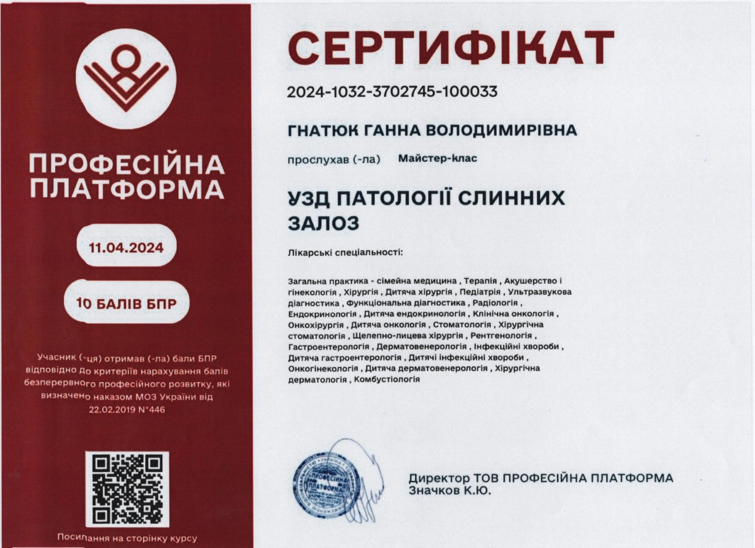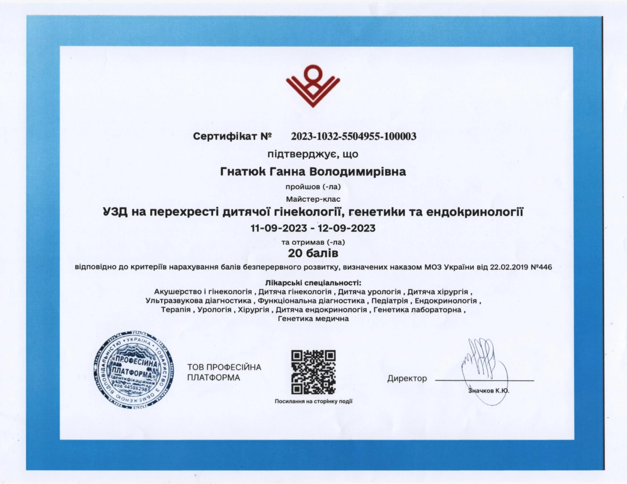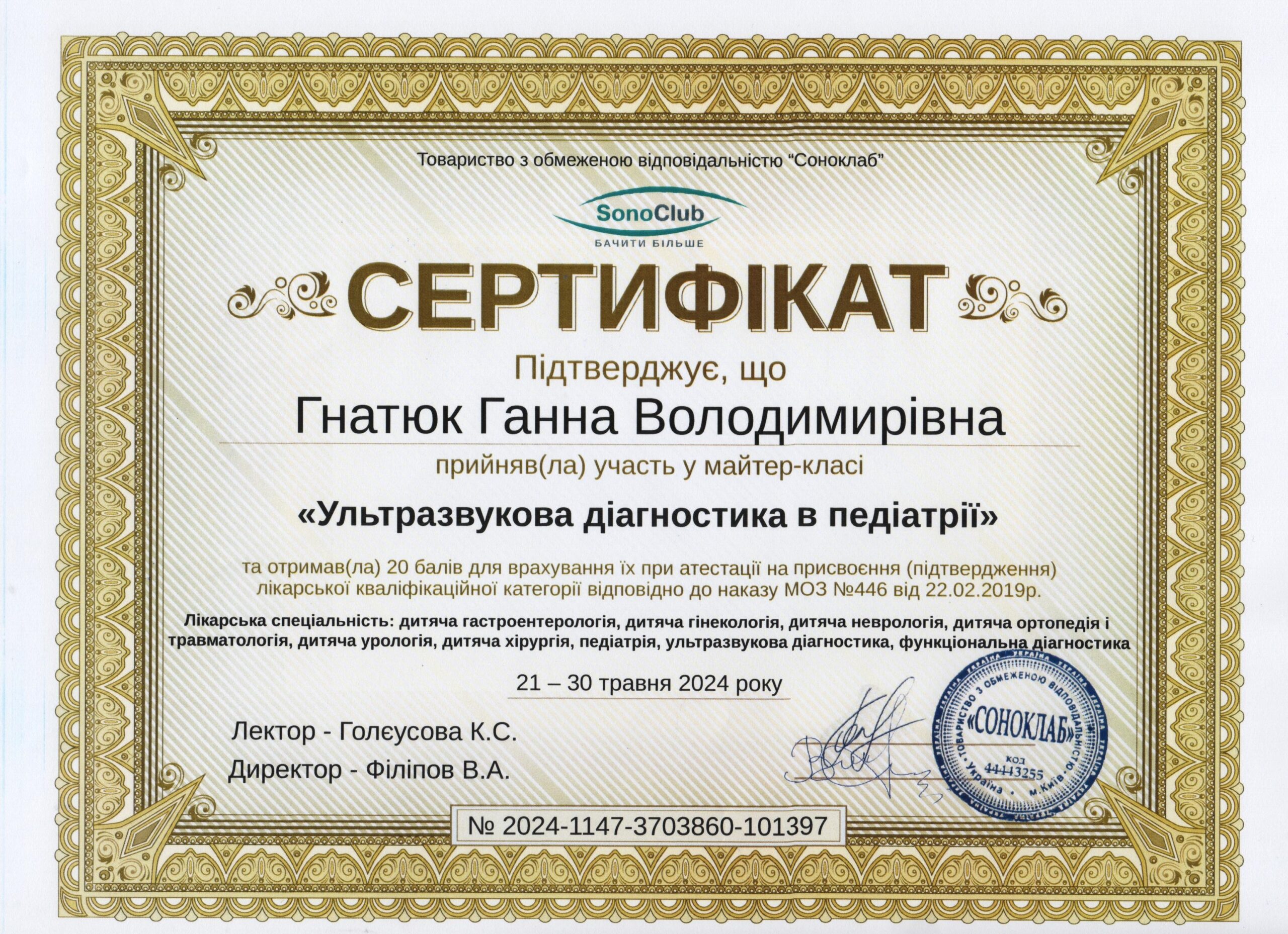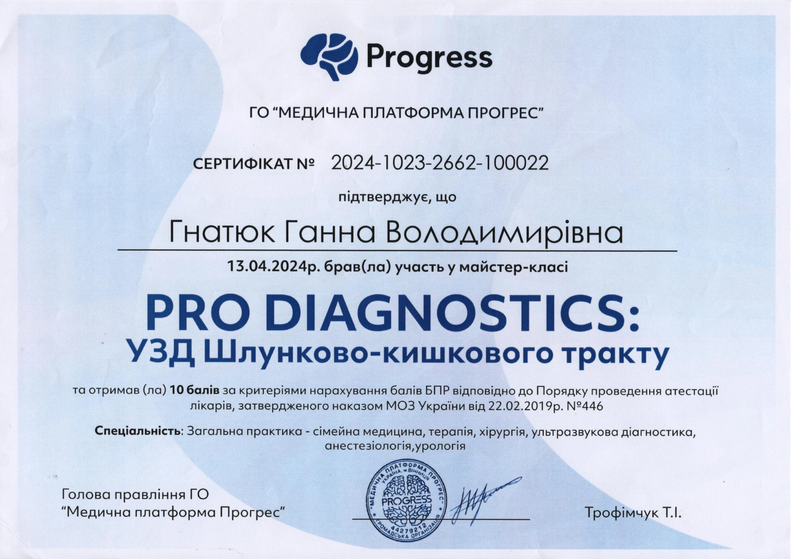 - Сертифікація (пренатальний скринінг) — FMF ID 294445 (повне ліцензування — комірцевий простір, носова кістка, кровоплин у венозній протоці, трикуспідальний кровоплин, скринінг прееклампсії), 2023