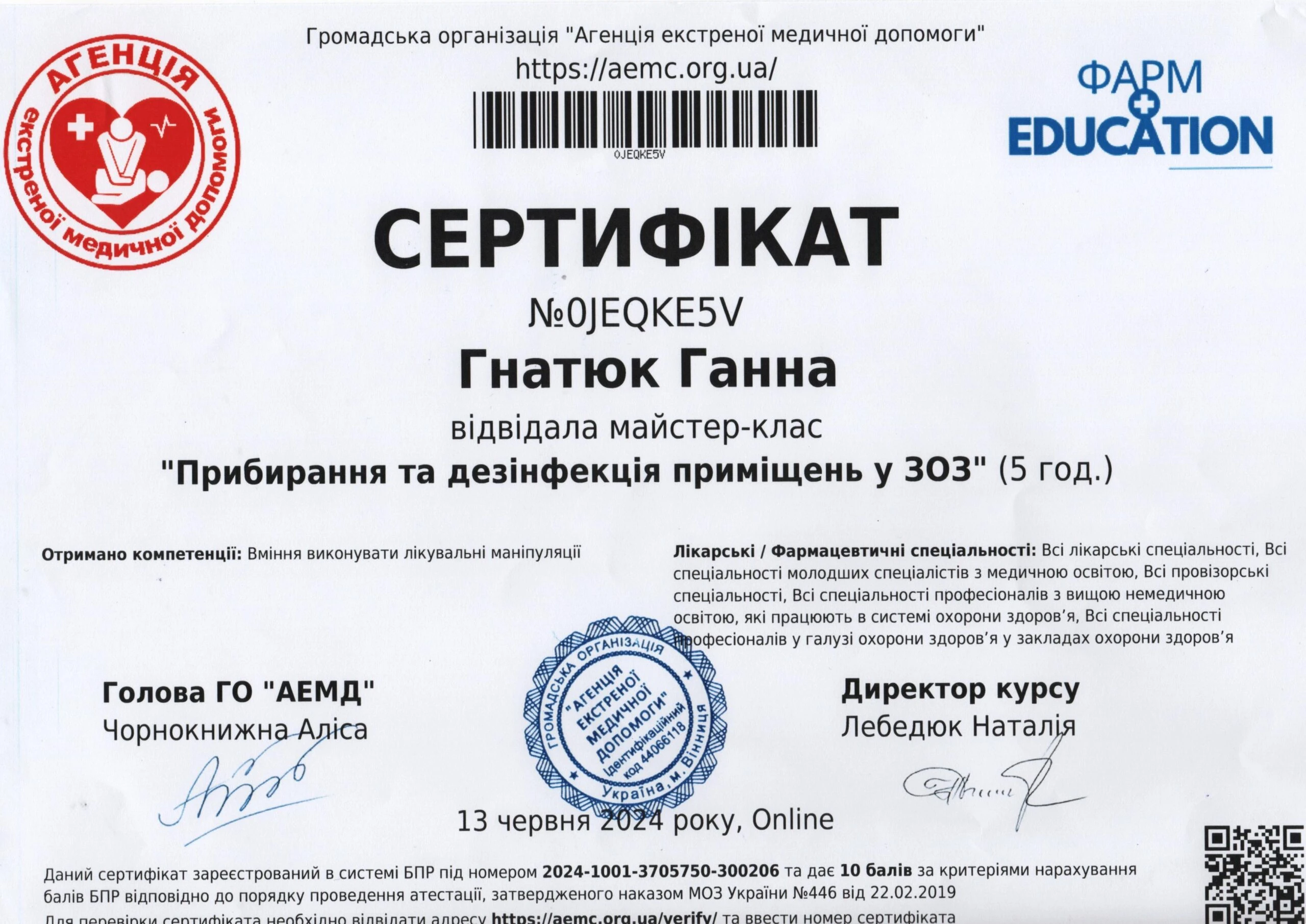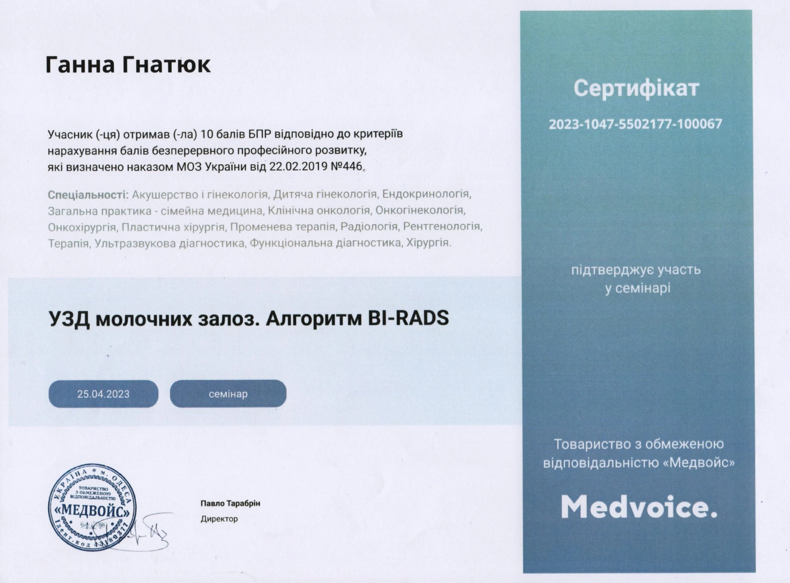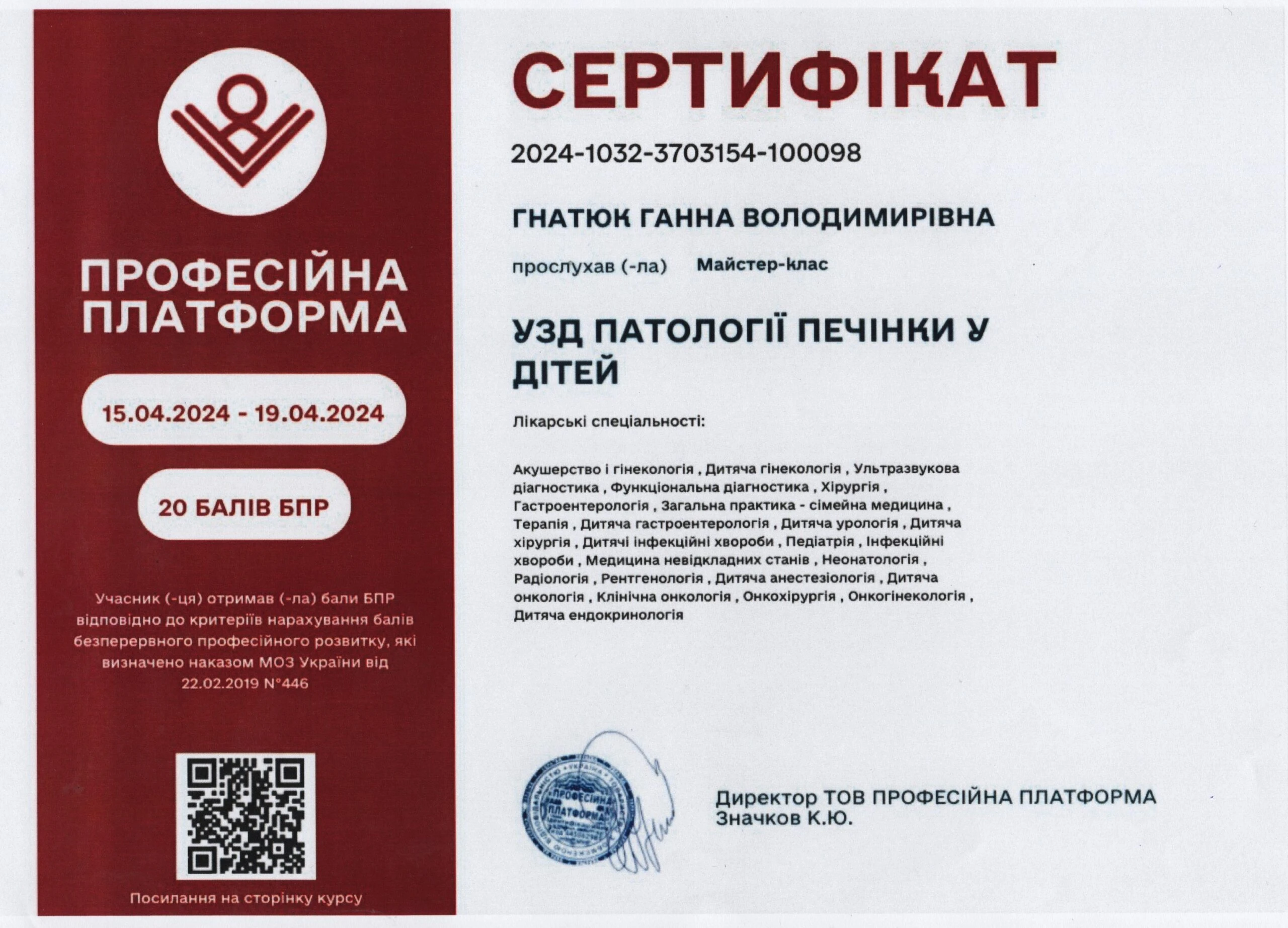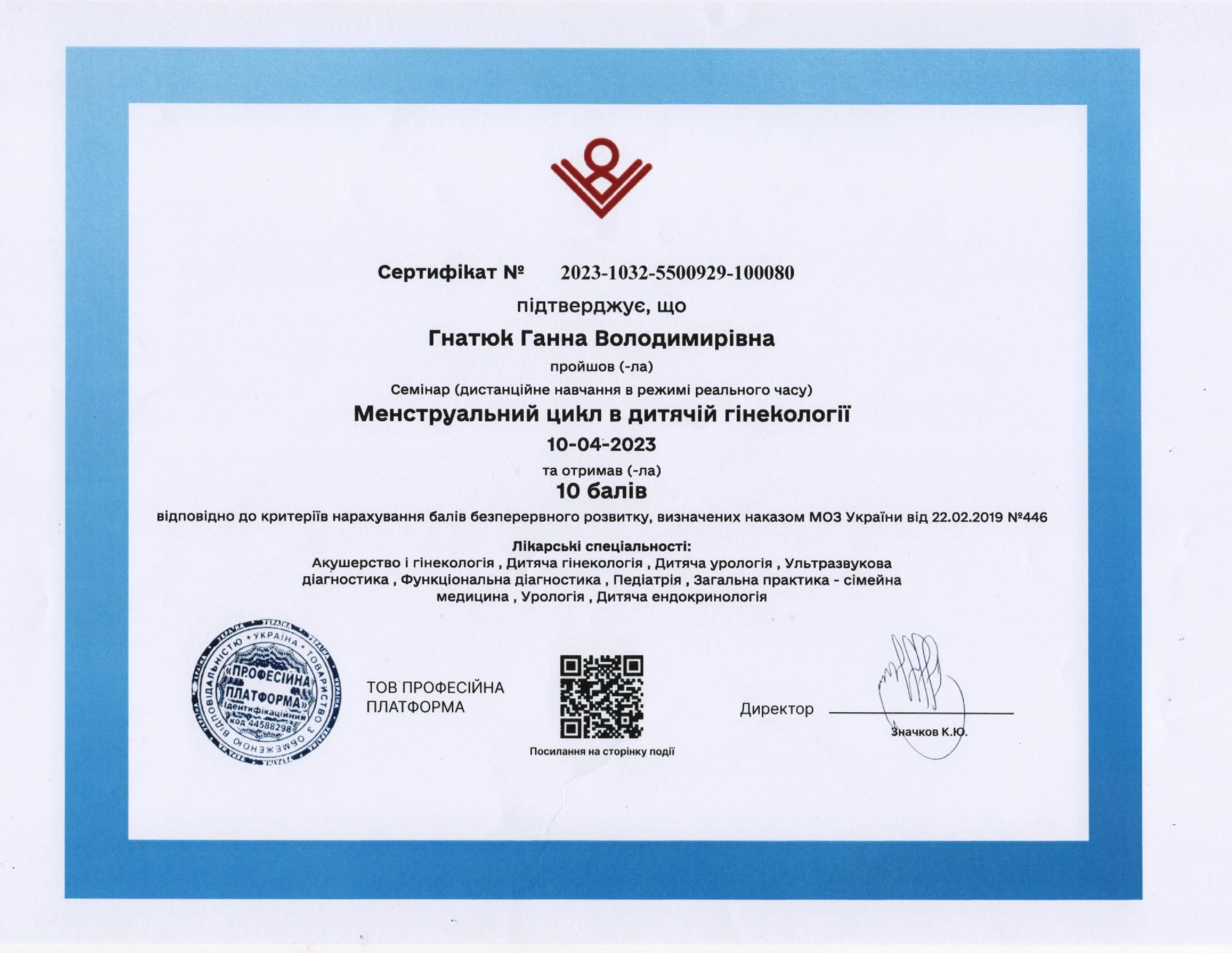 - Сертифікація (пренатальний скринінг) — FMF ID 294445 (повне ліцензування — комірцевий простір, носова кістка, кровоплин у венозній протоці, трикуспідальний кровоплин, скринінг прееклампсії), 2023