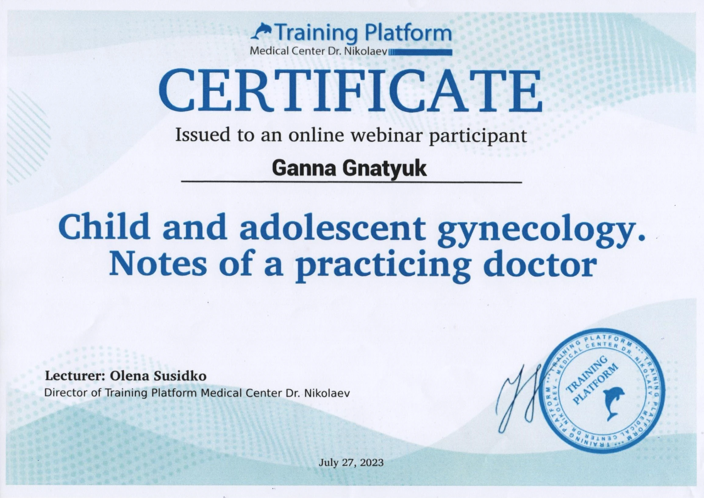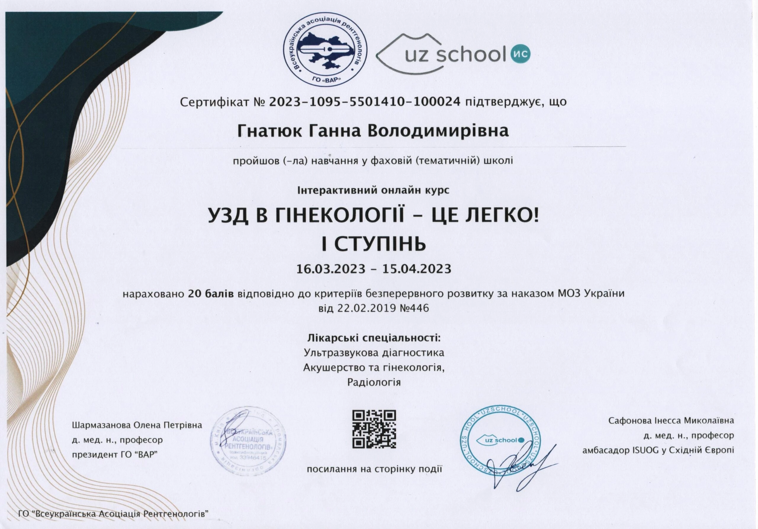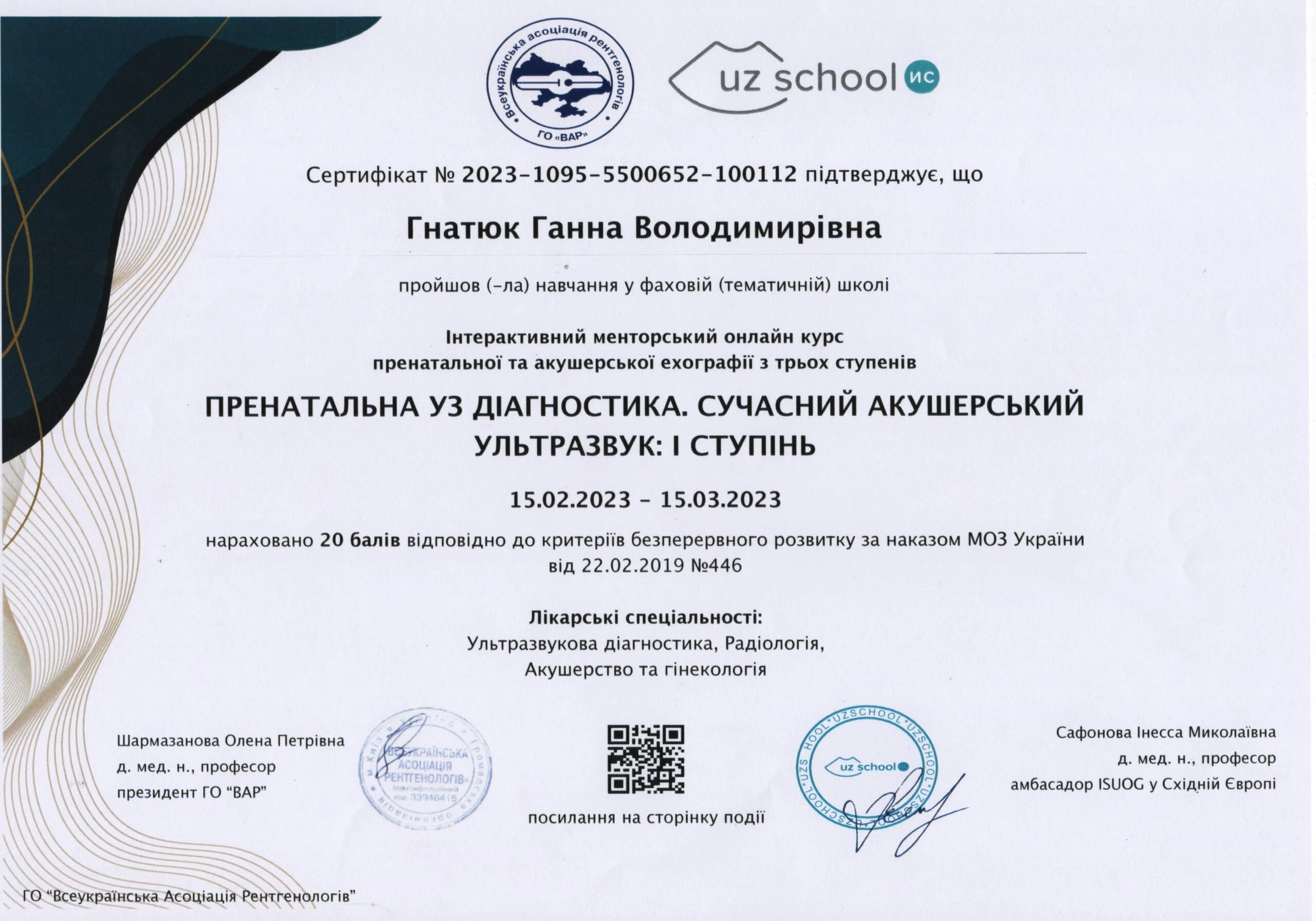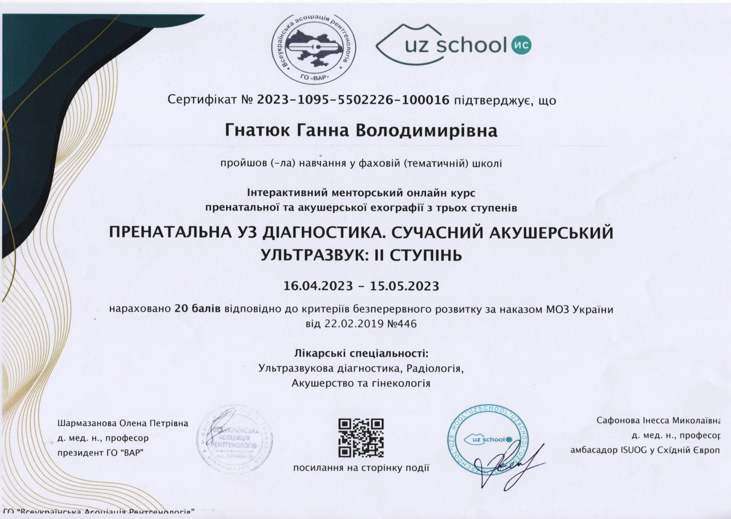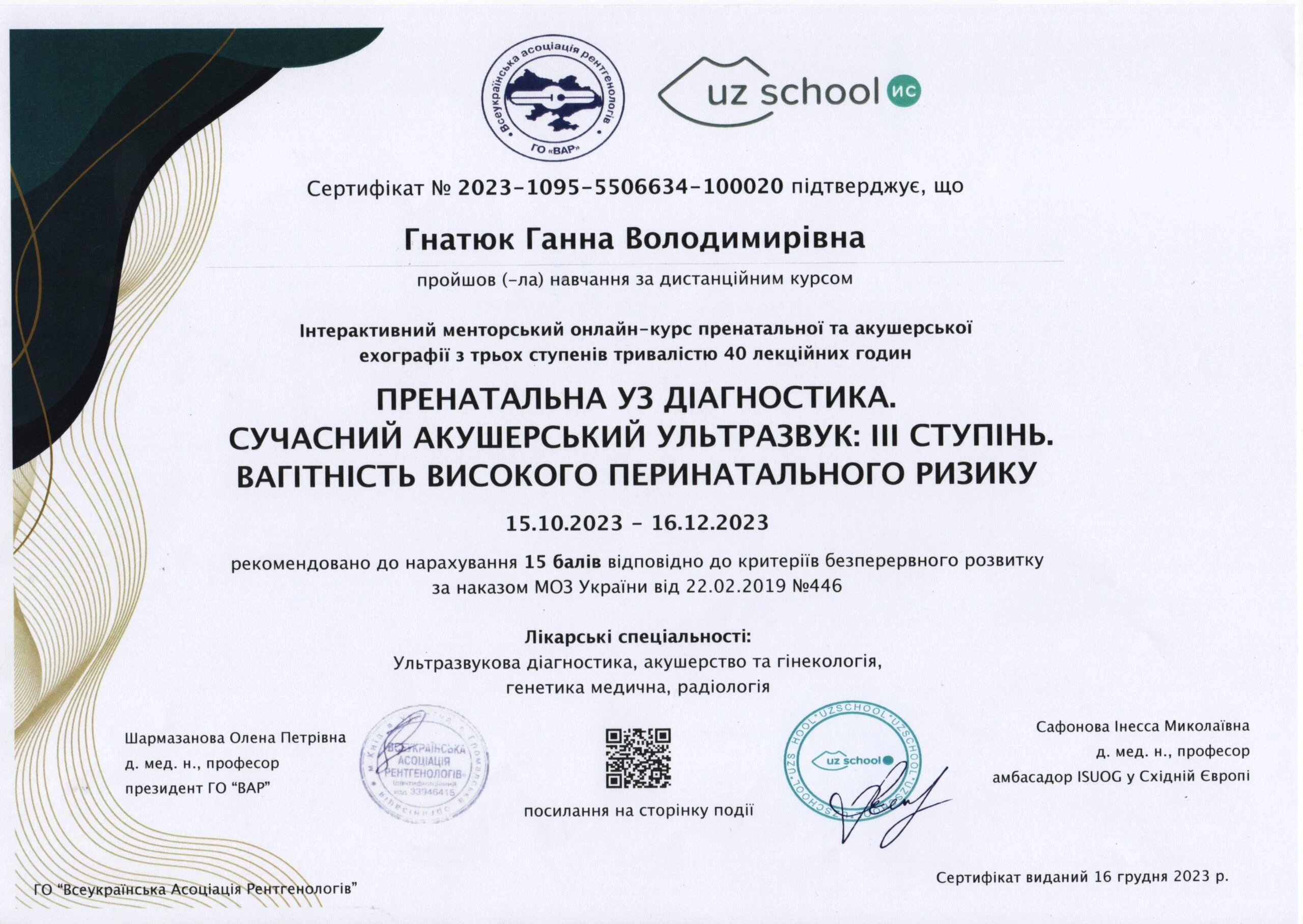 - Тематичне удосконалення «Комплексна пренатальна діагностика», на базі центру Геном; постійне навчання на базі UZ SCHOOL Інесси Сафонової акушерство/гінекологія від початкового до експертного рівня), 2023