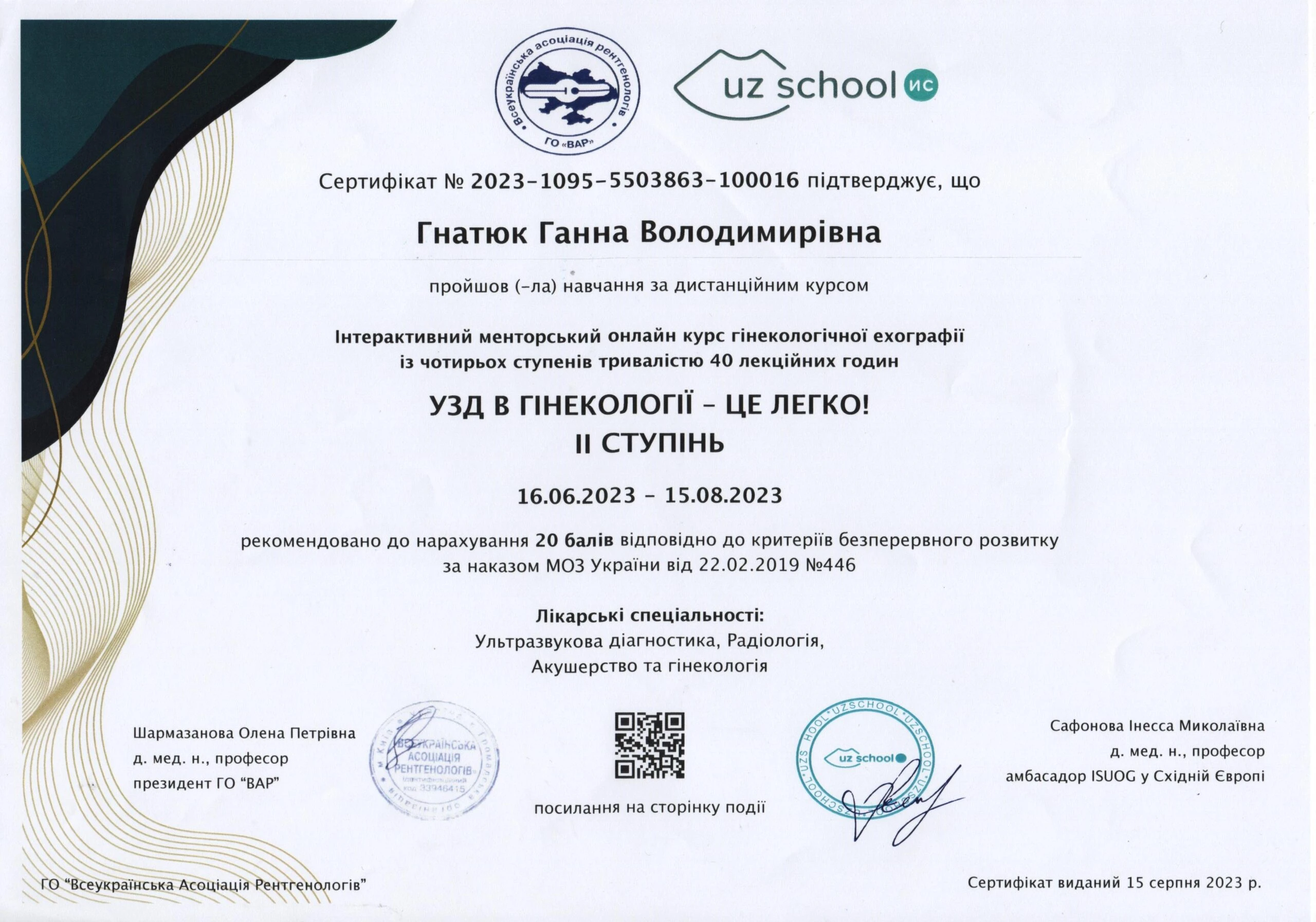 - Тематичне удосконалення «Основи УЗД в практиці лікаря акушера-гінеколога з елементами симуляційного навчання», 2023