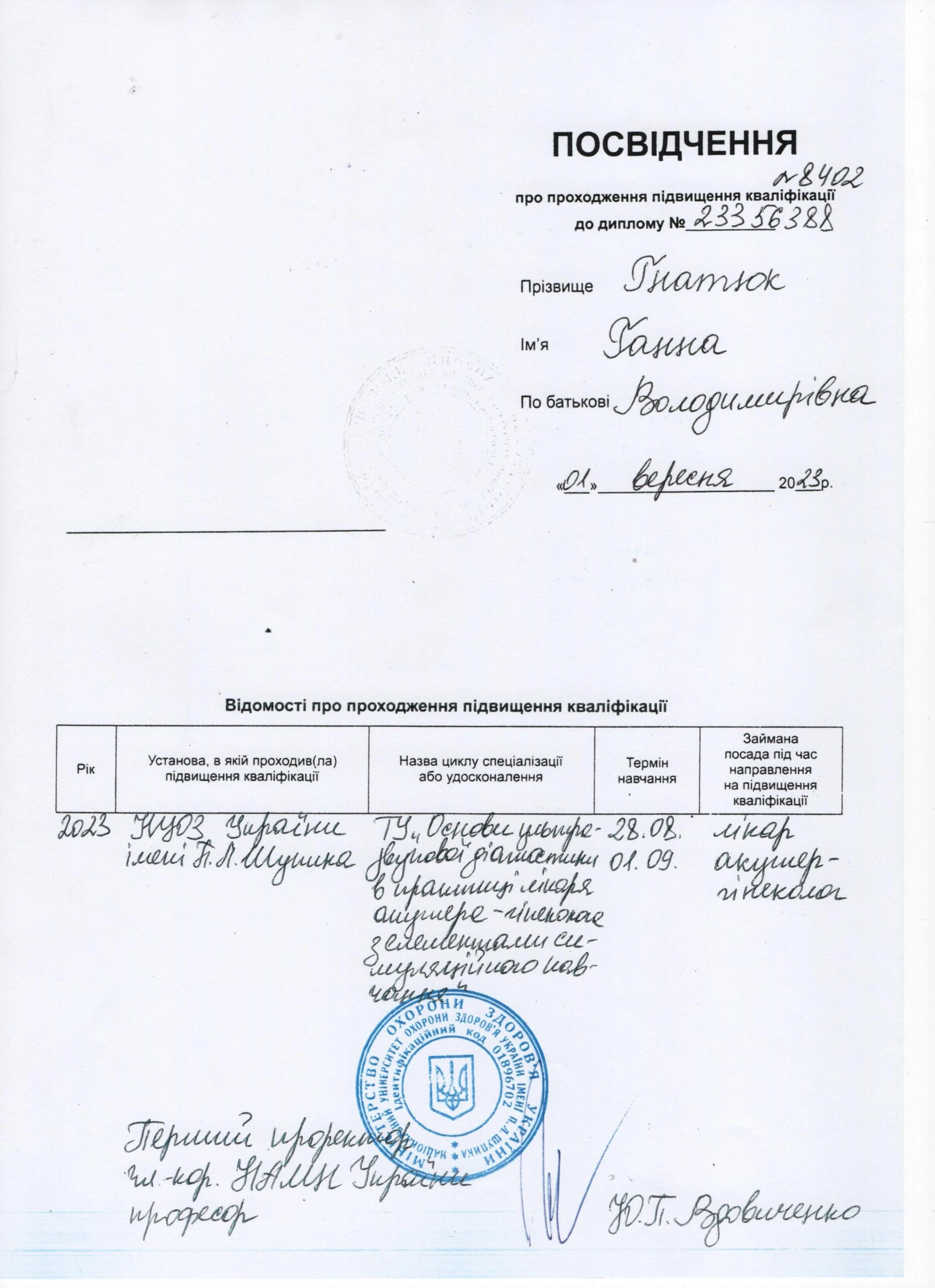 - Національна медична академія післядипломної освіти імені П. Л. Шупика, спеціальність «Управління та організація охороною здоровʼя», 2023