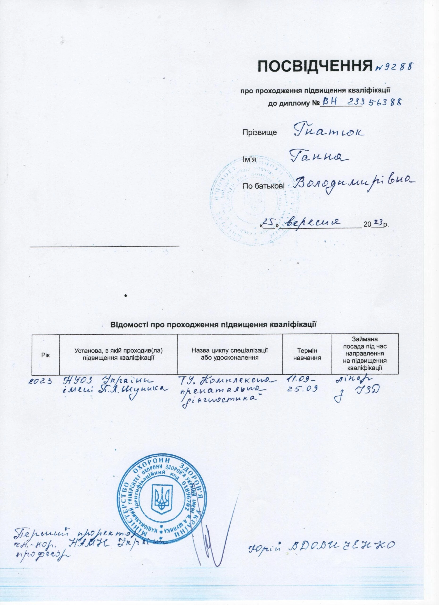 - Національна медична академія післядипломної освіти імені П. Л. Шупика, спеціальність «Ультразвукова діагностика», 2015