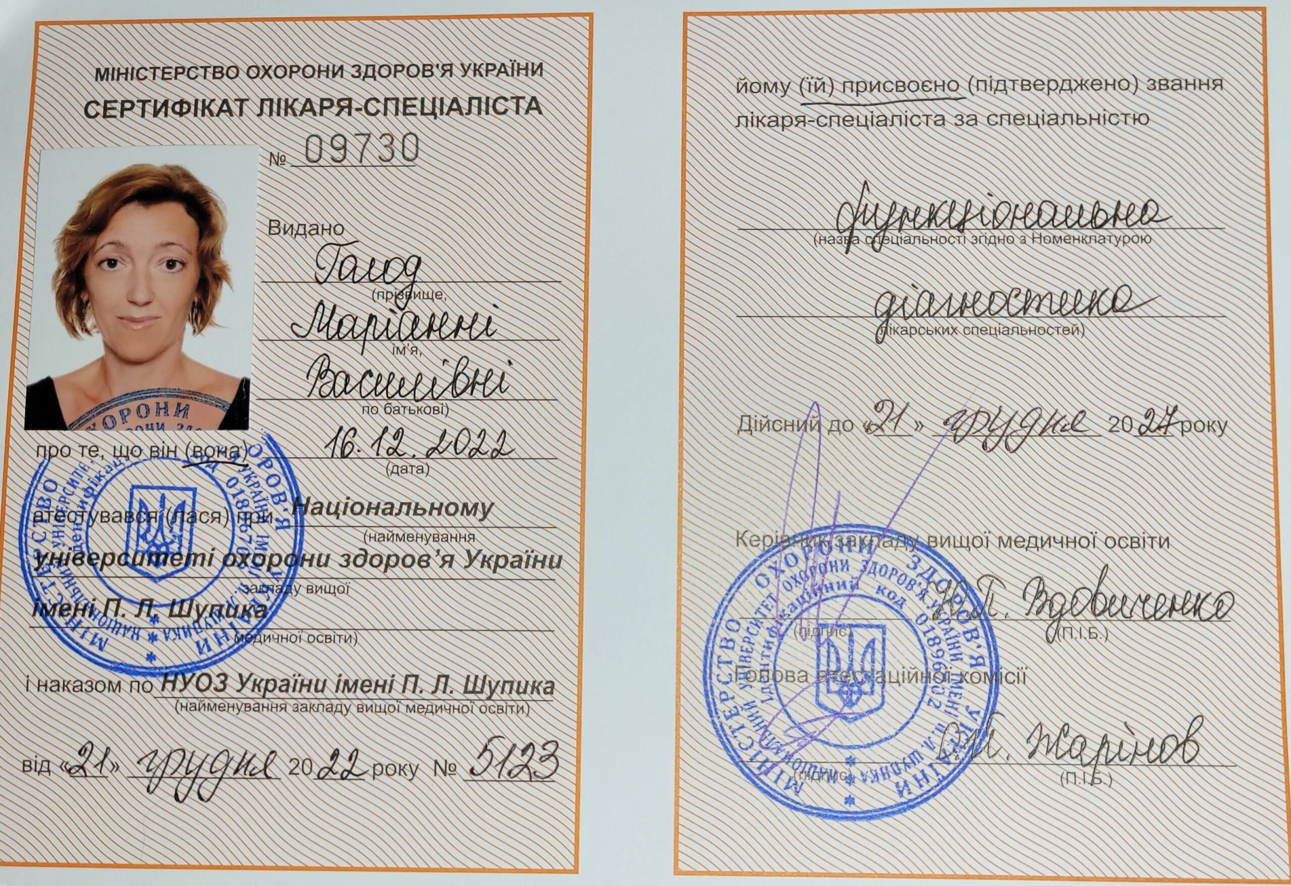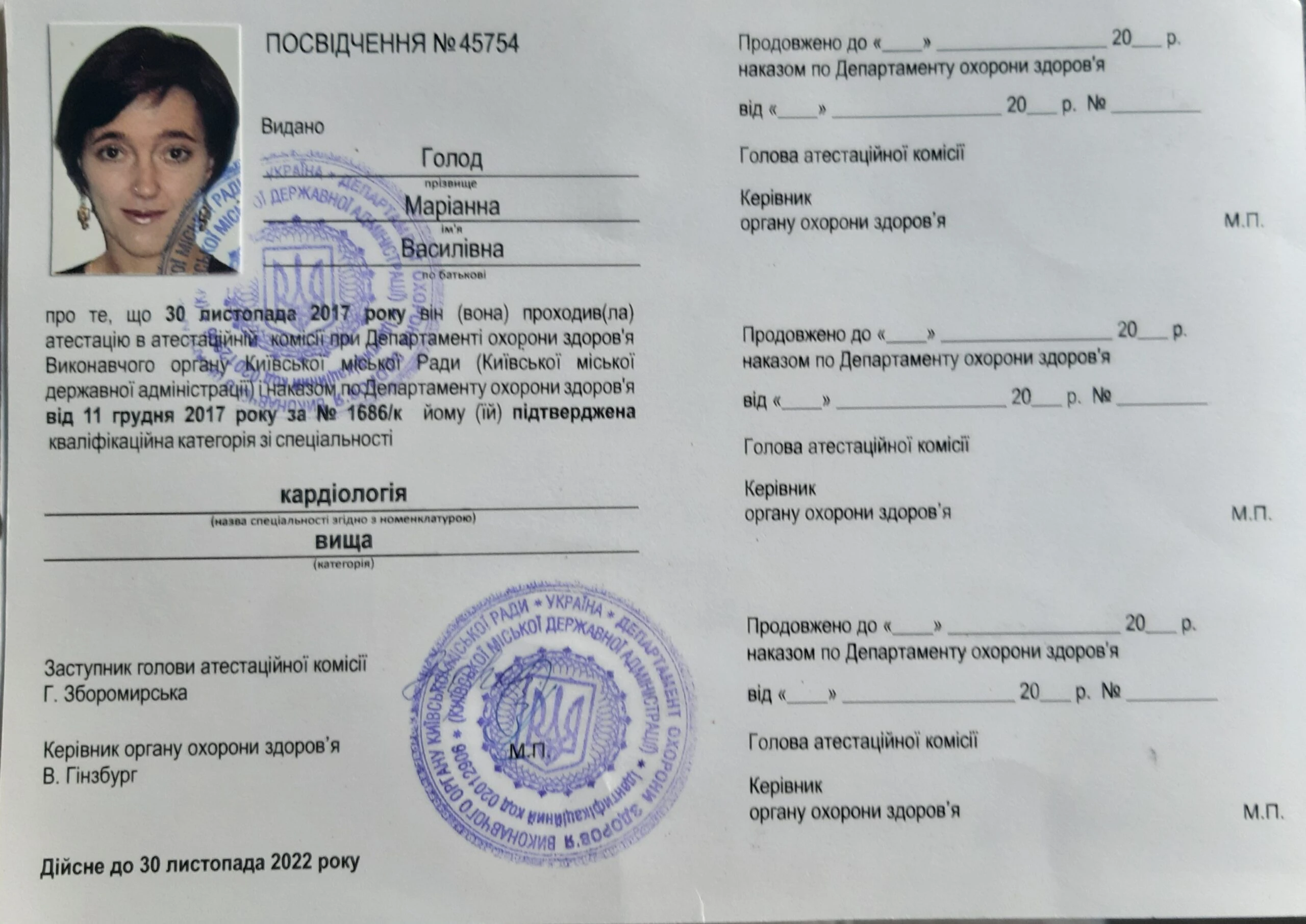 Лікар-кардіолог вищої категорії, лікар-терапевт першої категорії, лікар функціональної діагностики, сімейний лікар, лікар ультразвукової діагностики