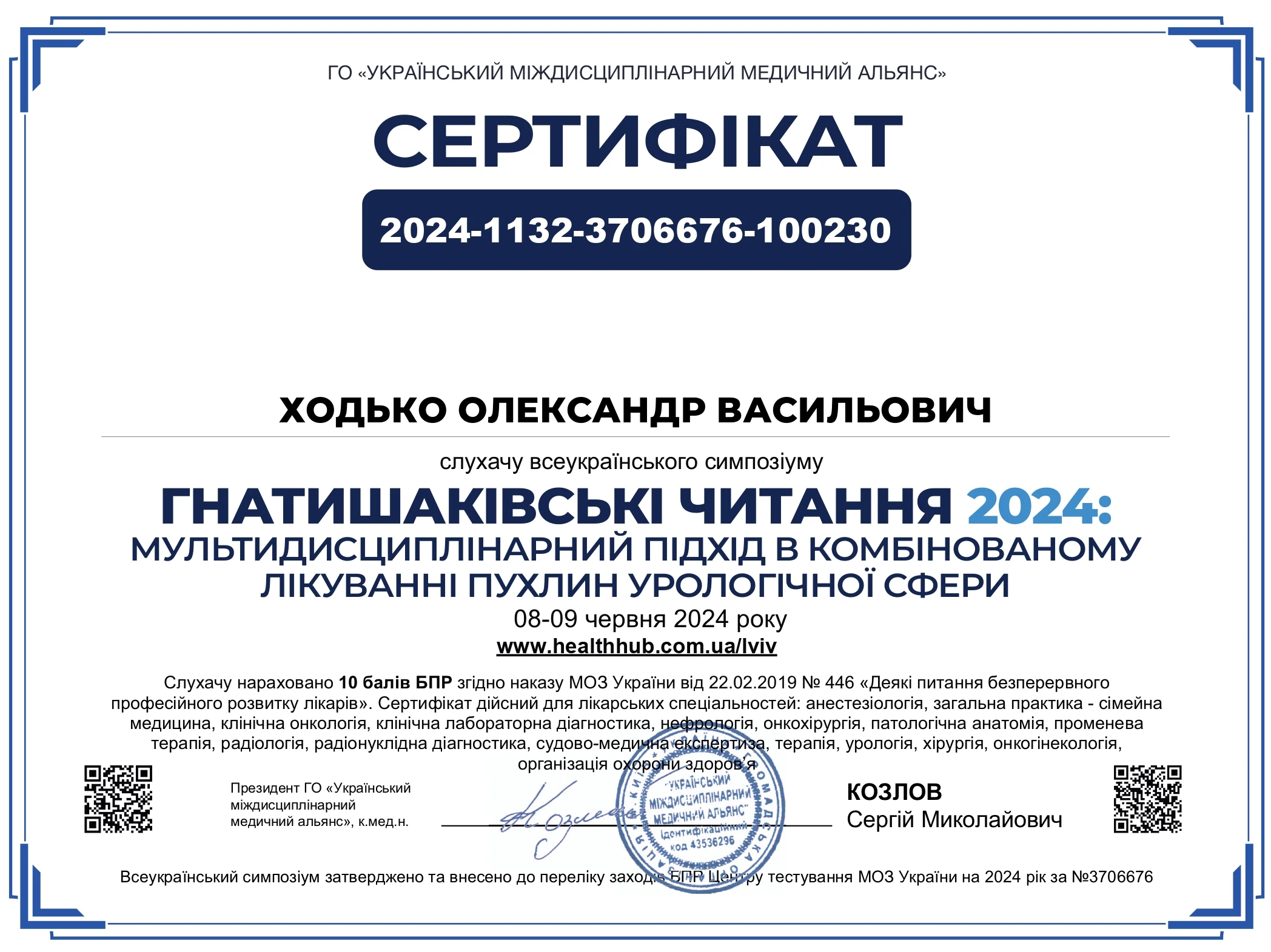 • Національний медичний університет імені О.О. Богомольця, спеціальність «Лікувальна справа», 2006