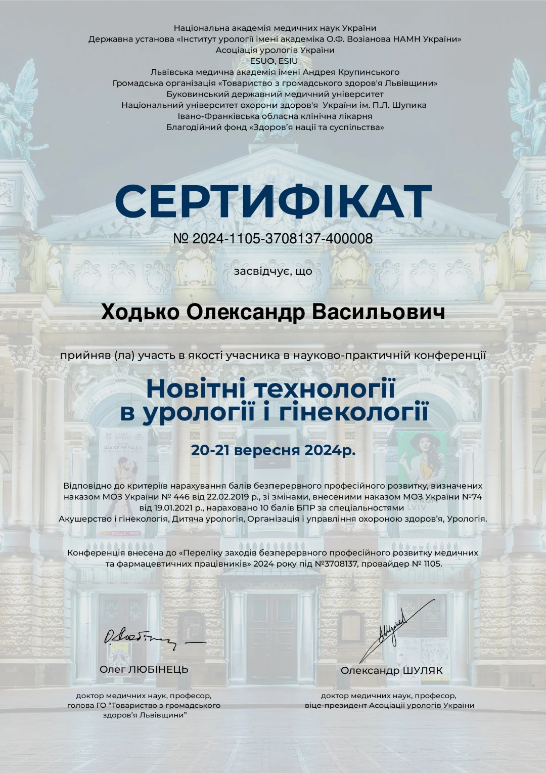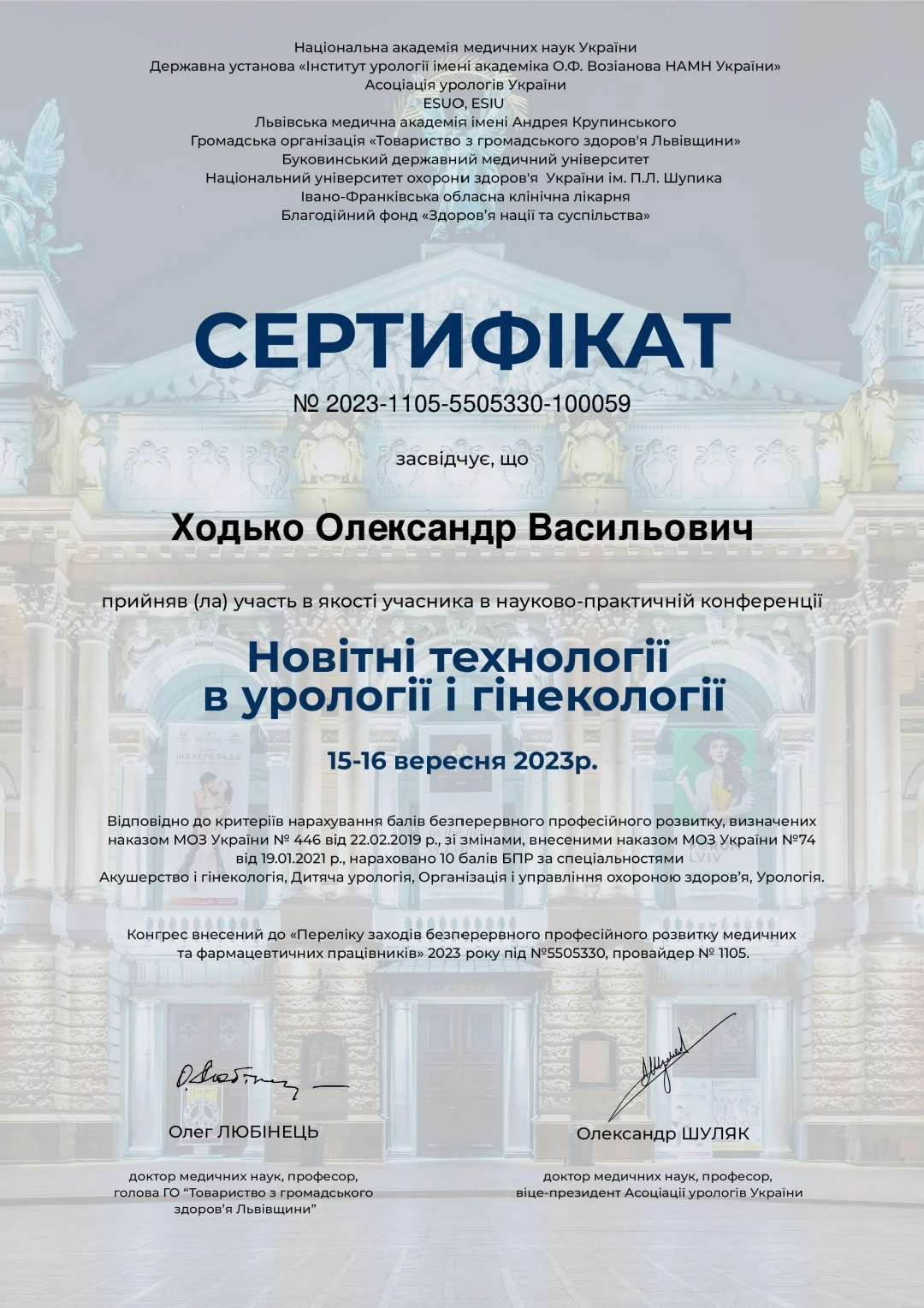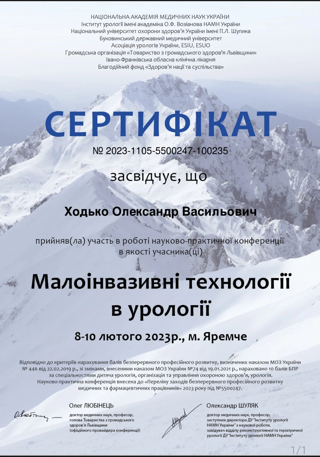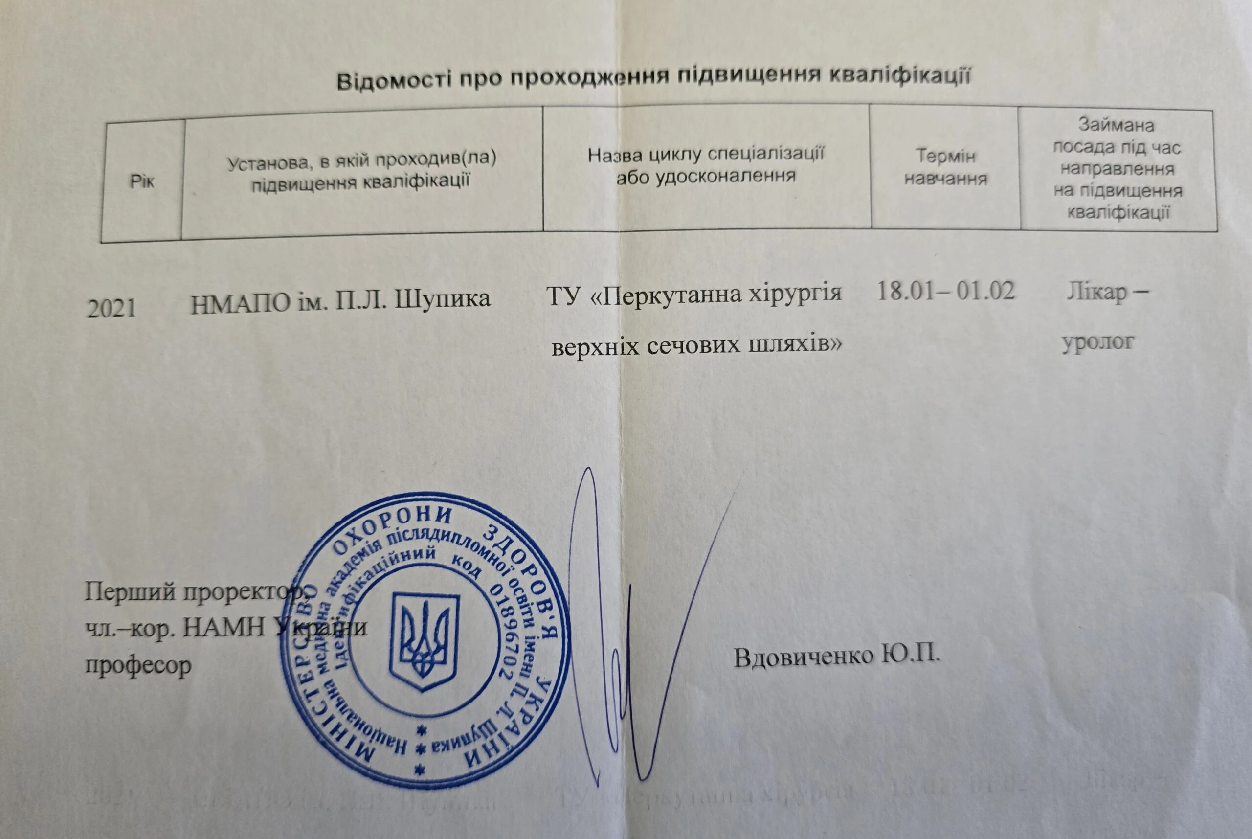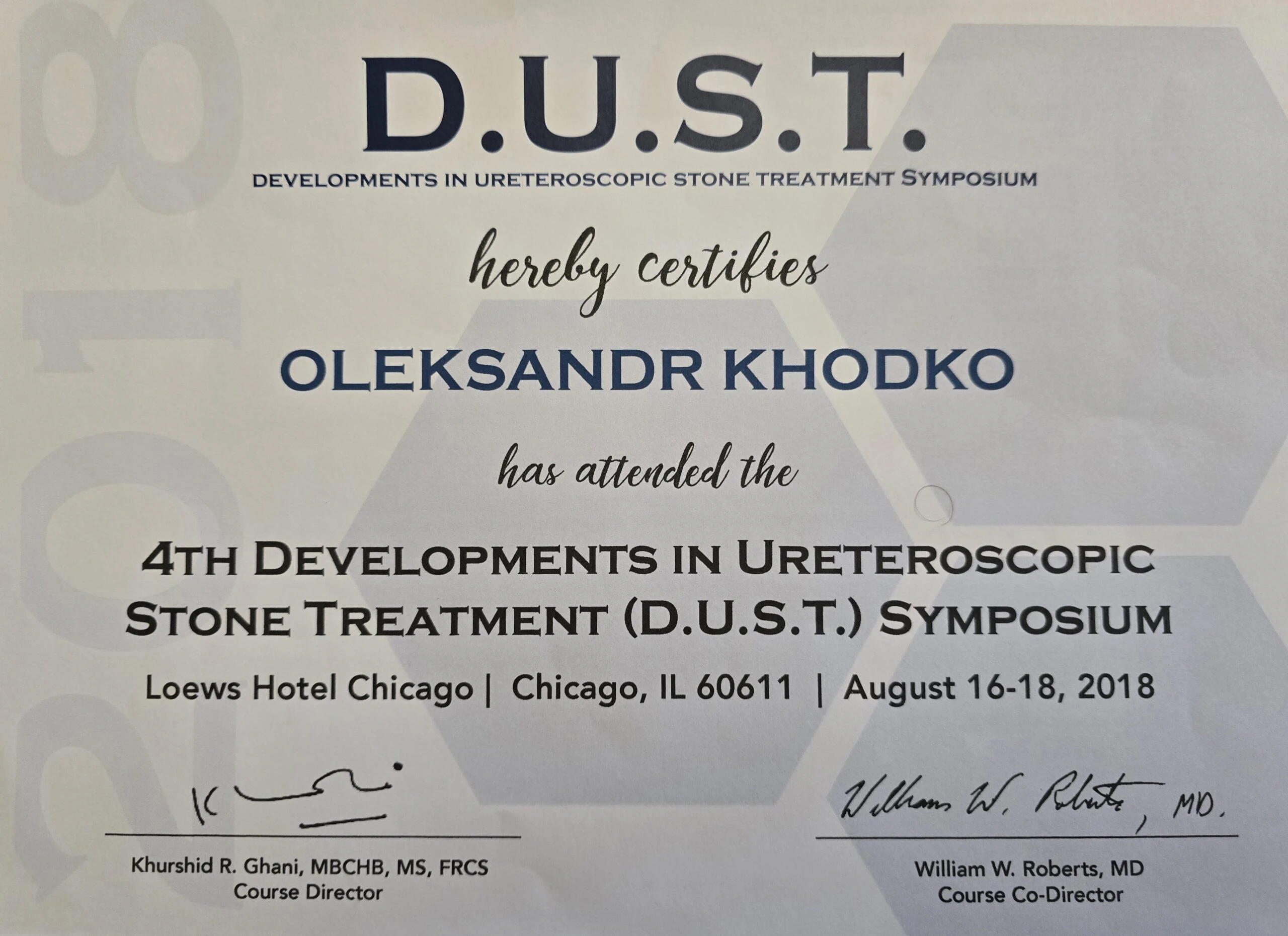 • Сертифікат по лазерній літотрипсії — США, Чикаго