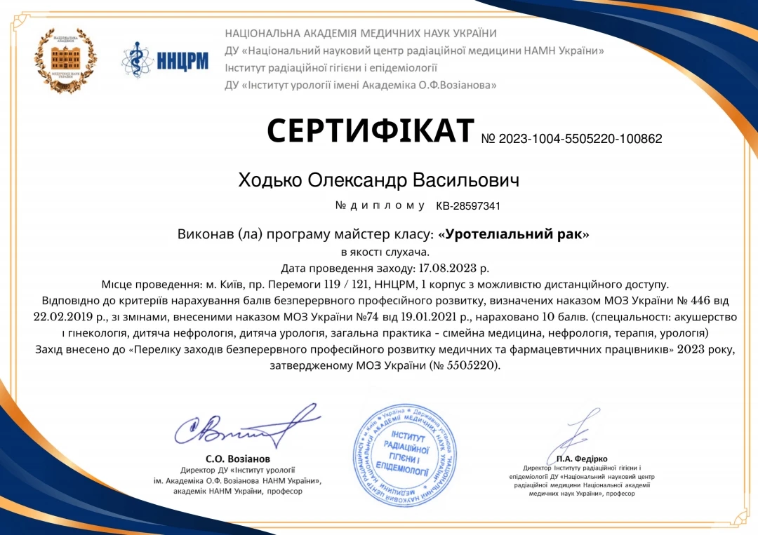 Дуже вдячна урологу Олександру Ходько за високий ступінь професіоналізму. Лікар дуже уважний, грамотний та досвідчений. Понад 2 тижні в поліклініці мамі не могли знайти причину тривалої високої температури. І лише завдяки Олександру Васильовичу вдалося виявити причину та вчасно прооперувати. Моя найщиріша рекомендація та подяка лікарю!
