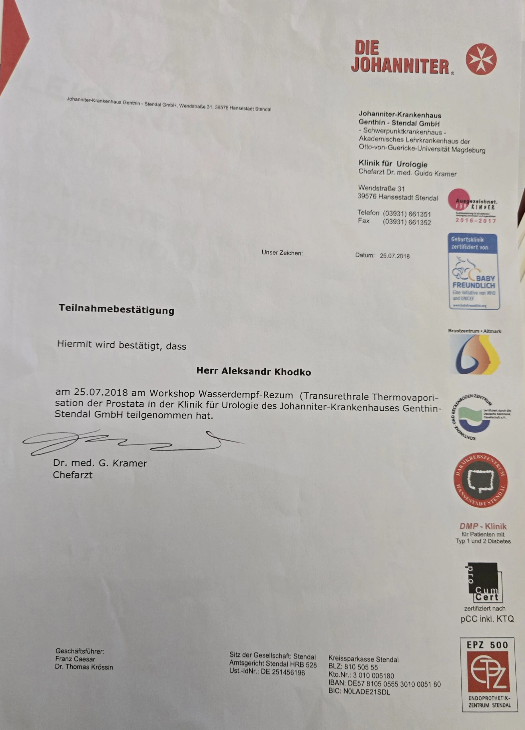 • Сертифікат по термоабляції простати — Німеччина