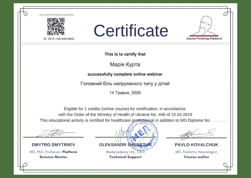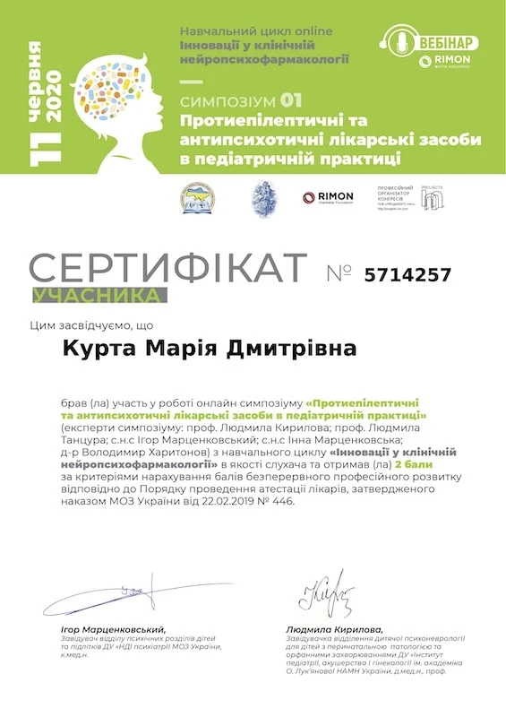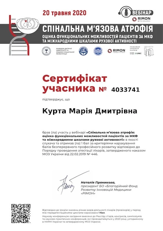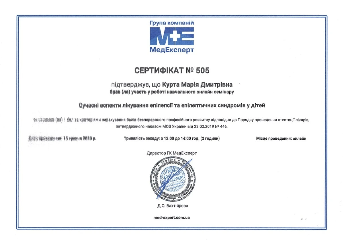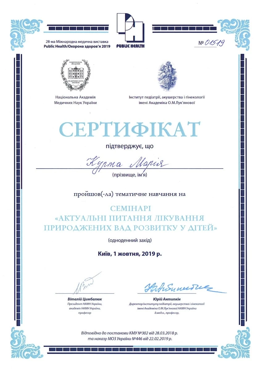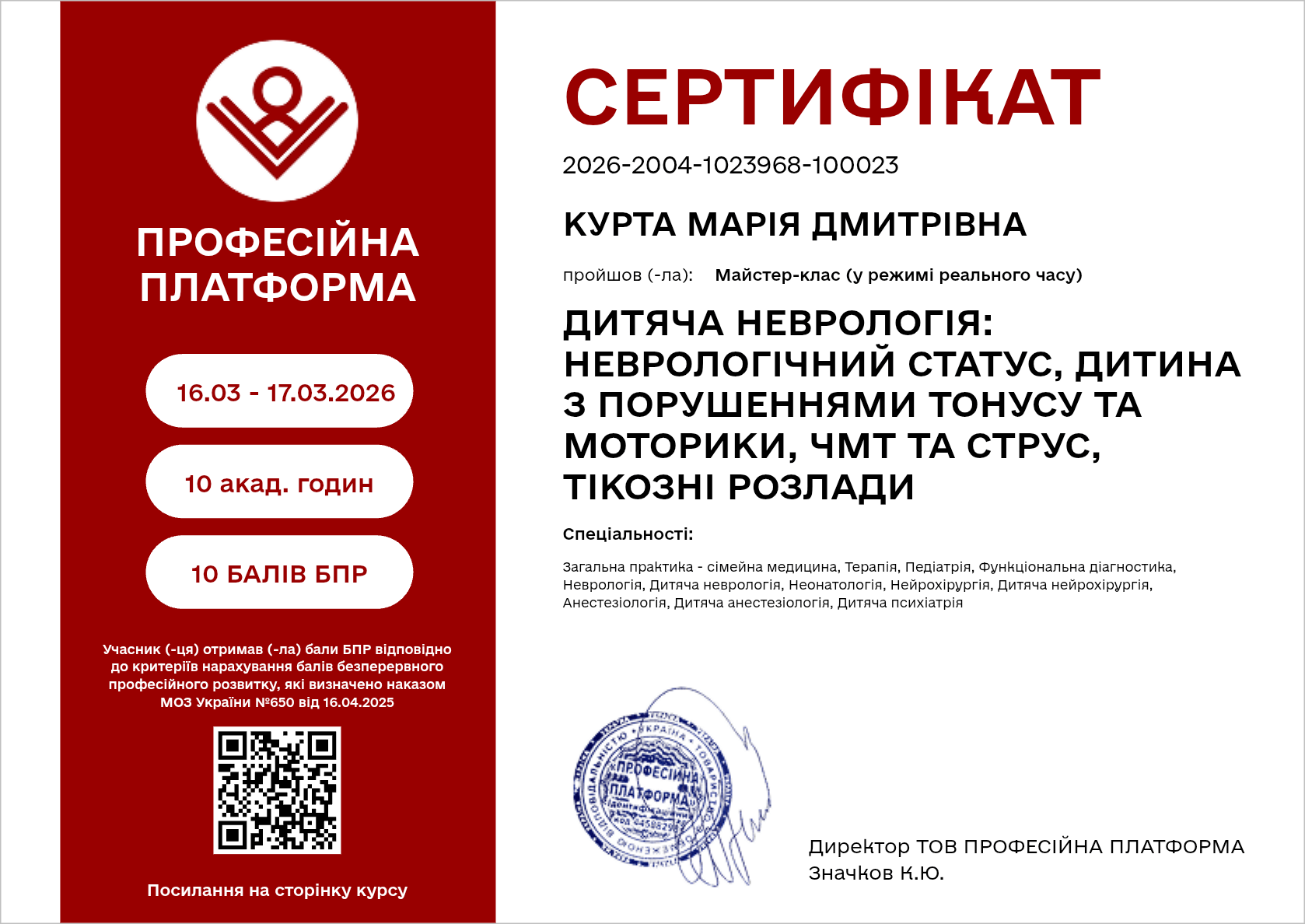 • Національна медична академія післядипломної освіти імені П. Л. Шупика, «Дитяча неврологія», 2006
