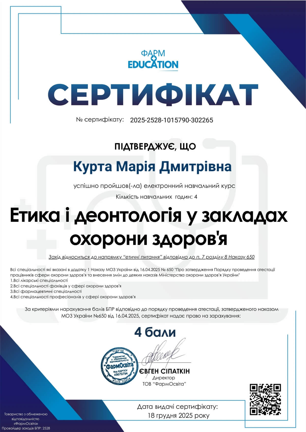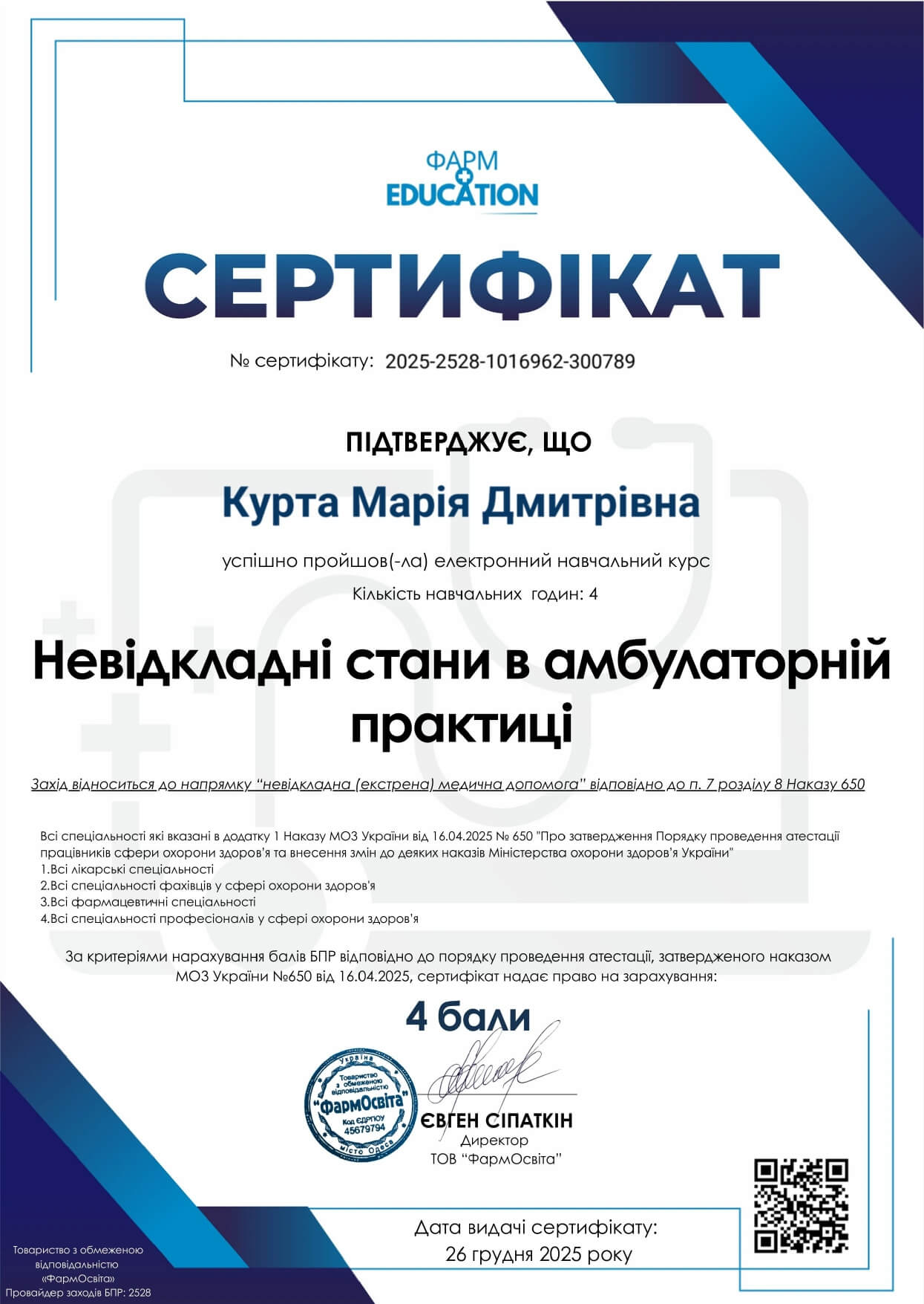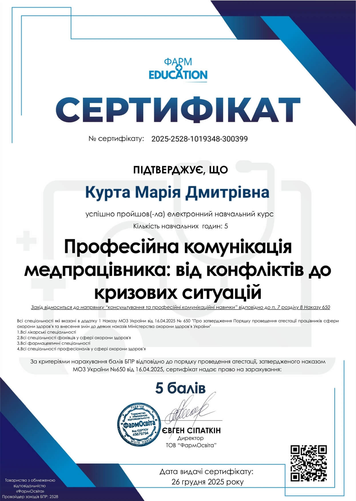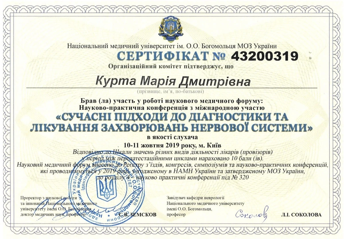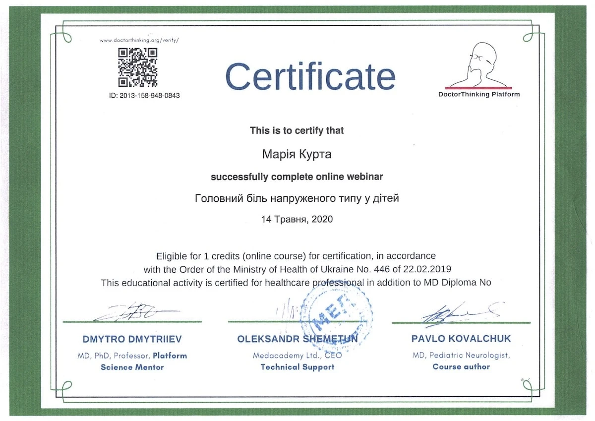 • Національна медична академія післядипломної освіти імені П. Л. Шупика, «Дитяча неврологія», 2006