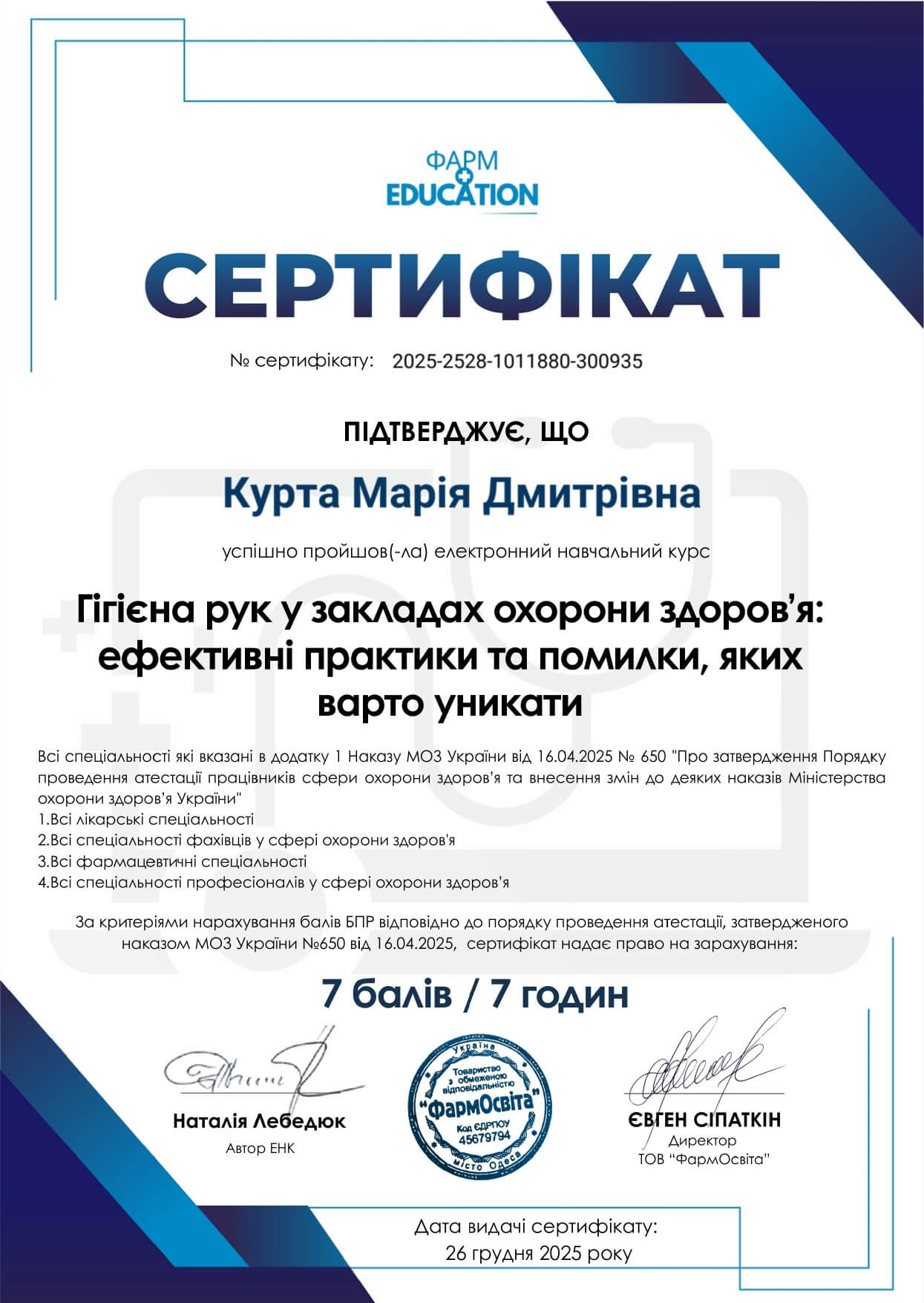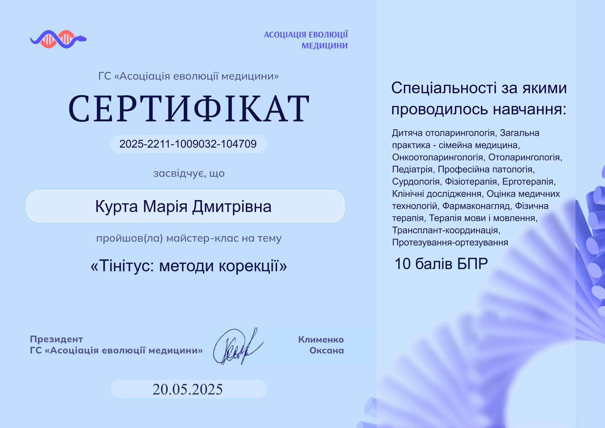 Дуже сподобався лікар Курта Марія Дмитрівна. Дуже гарно пояснює і спілкується з дитиною, знаходить підхід і слова) підбадьорює і призначає вірне лікування! Дякуємо!!