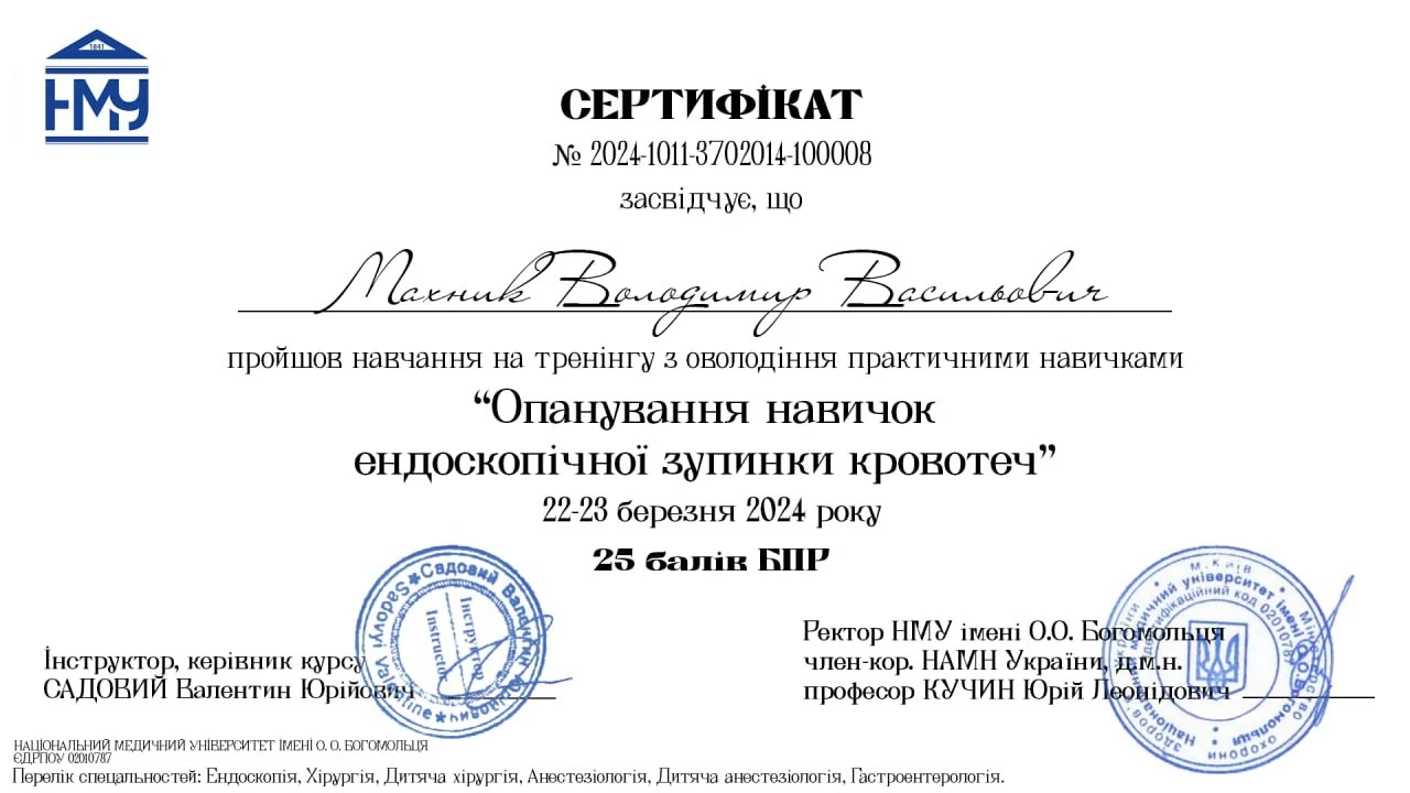 - Спеціалізація з ендоскопії, 2011