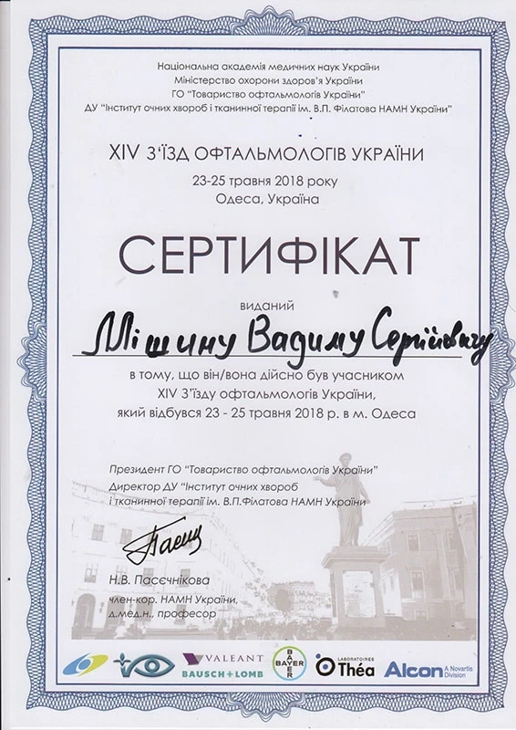 • Донецький державний медичний університет «Курс передатестаційного підвищення кваліфікації по офтальмології», 2002