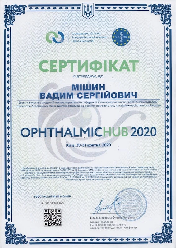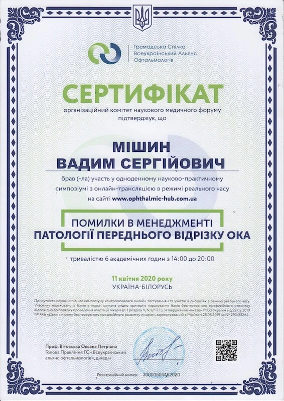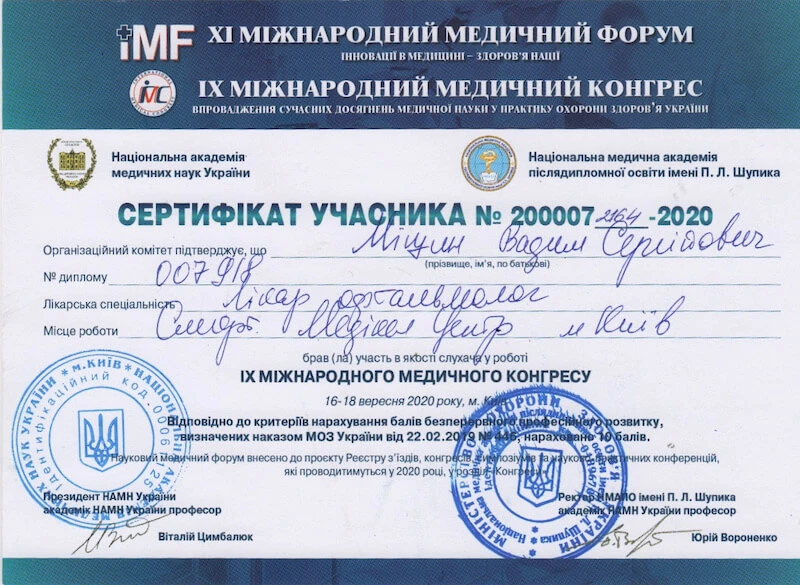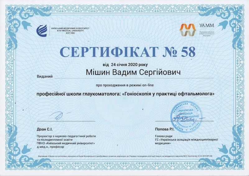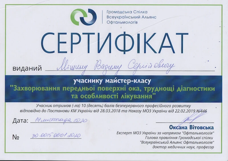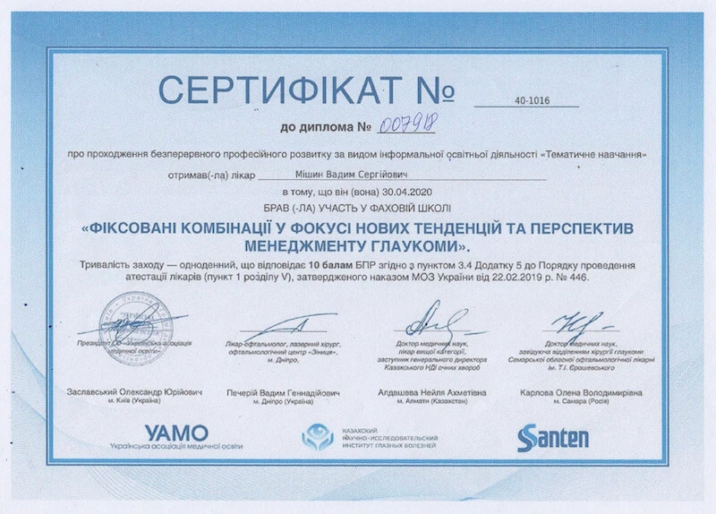 • Донецький державний медичний університет «Курс передатестаційного підвищення кваліфікації по офтальмології», 2007