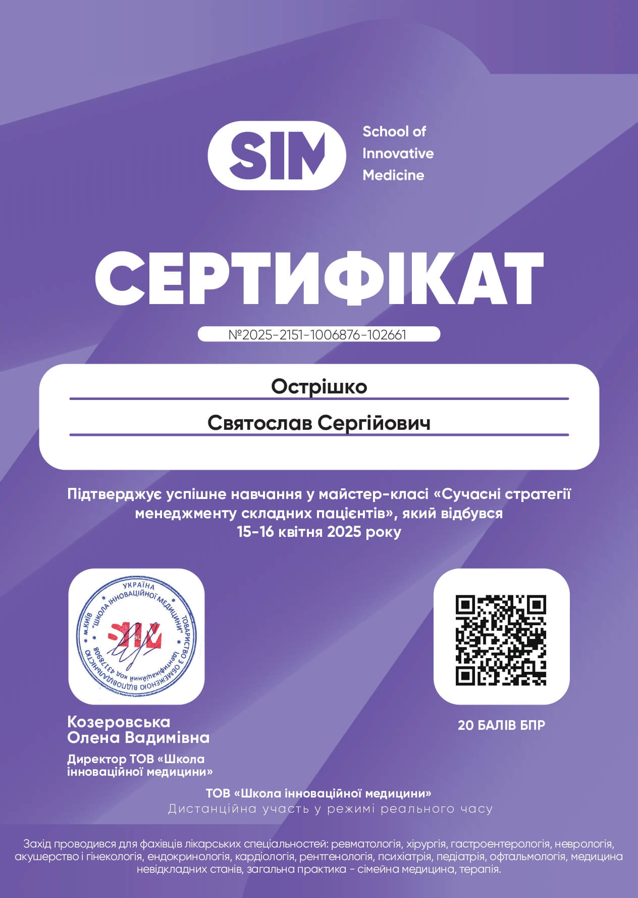 - Національна медична академія післядипломної освіти імені П.Л. Шупика, спеціальність «Проктологія», 2023
