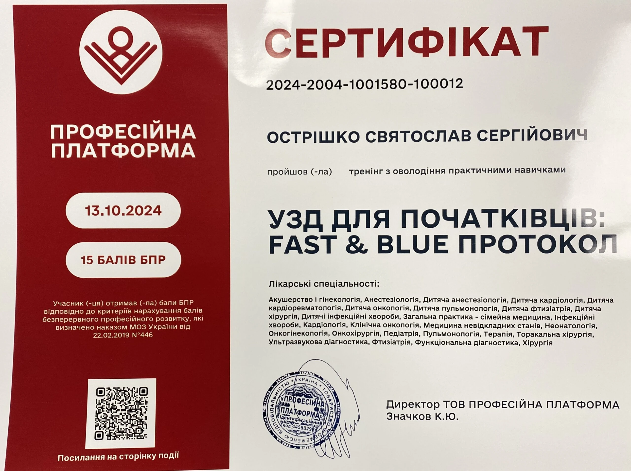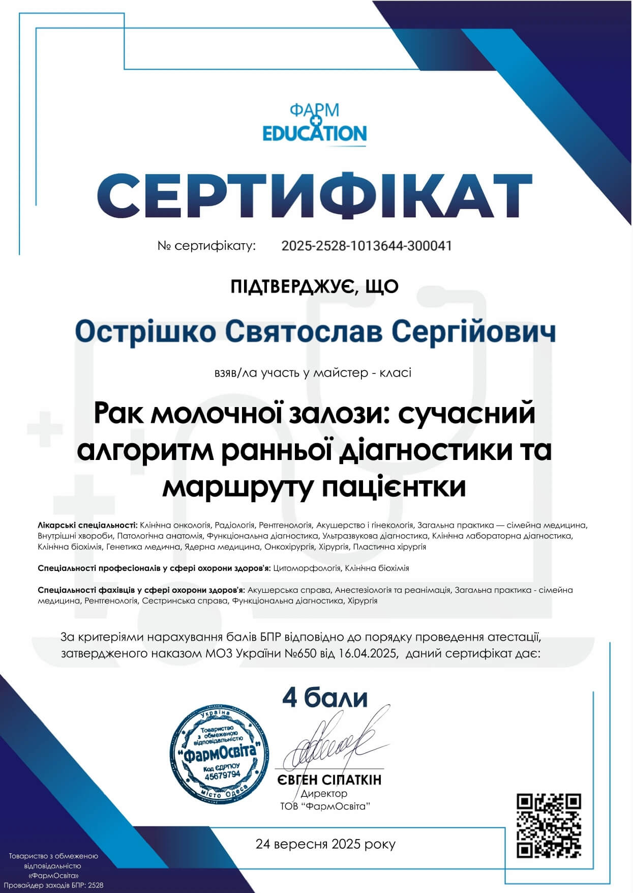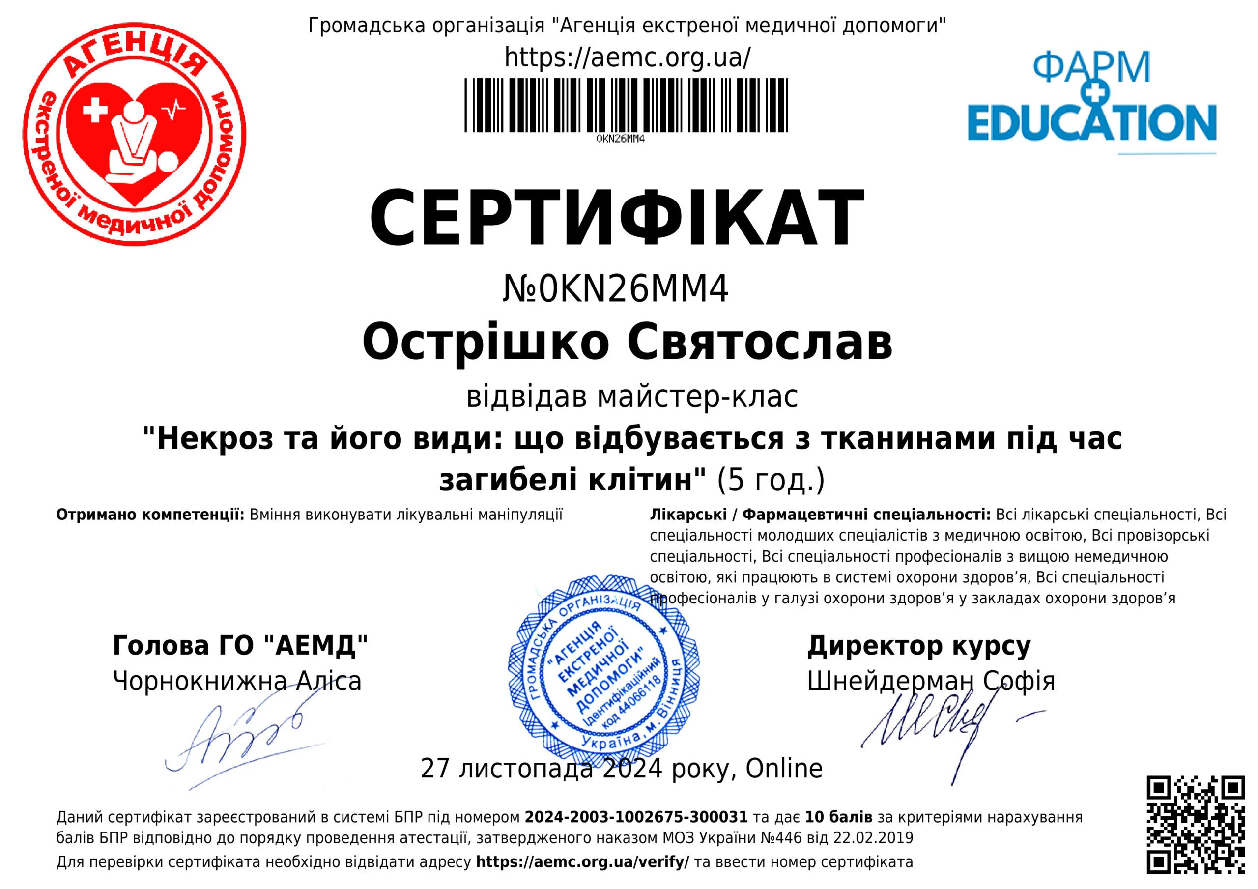 - Національна медична академія післядипломної освіти імені П.Л. Шупика, курси тематичного удосконалення «Амбулаторна проктологія», 2024