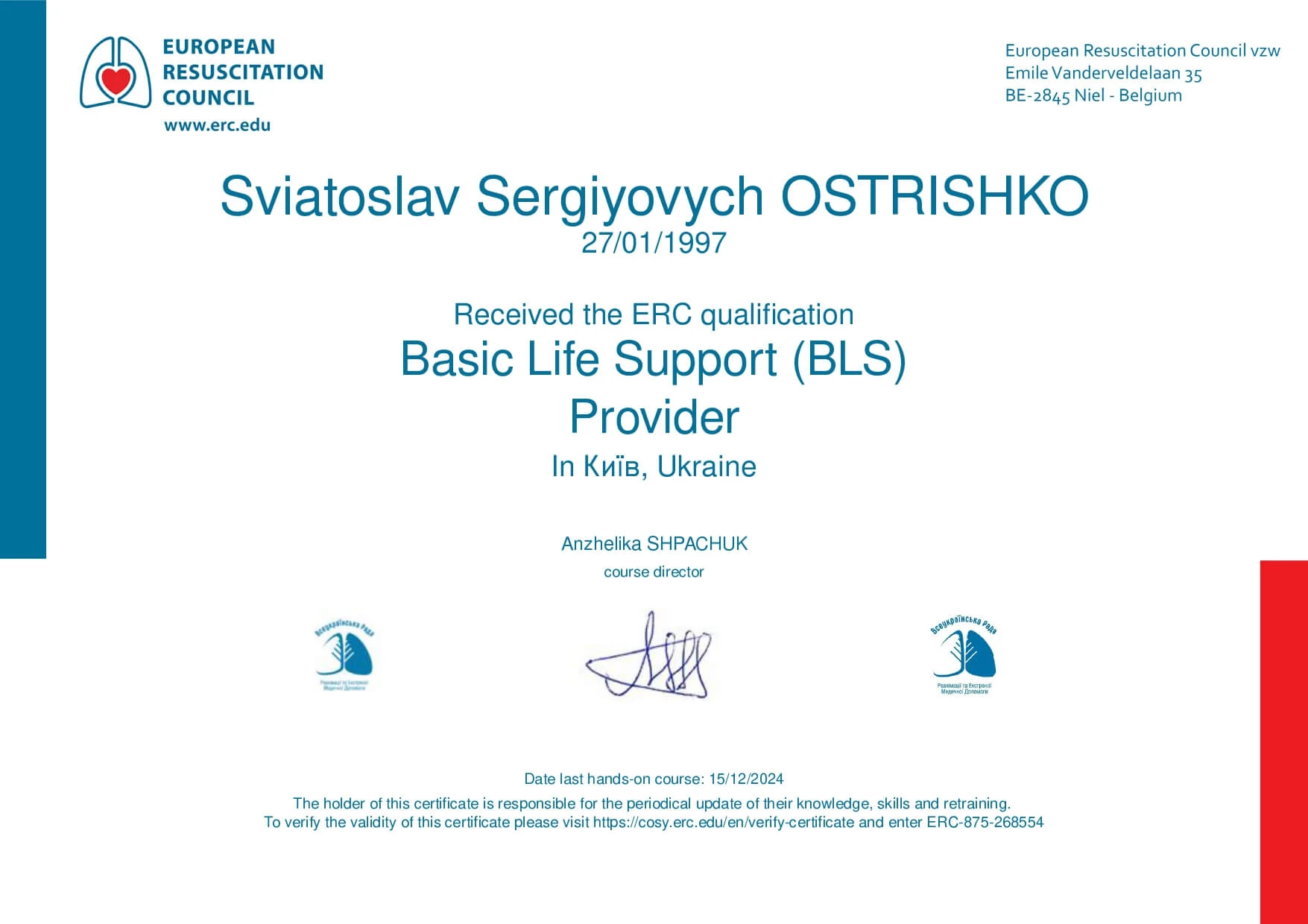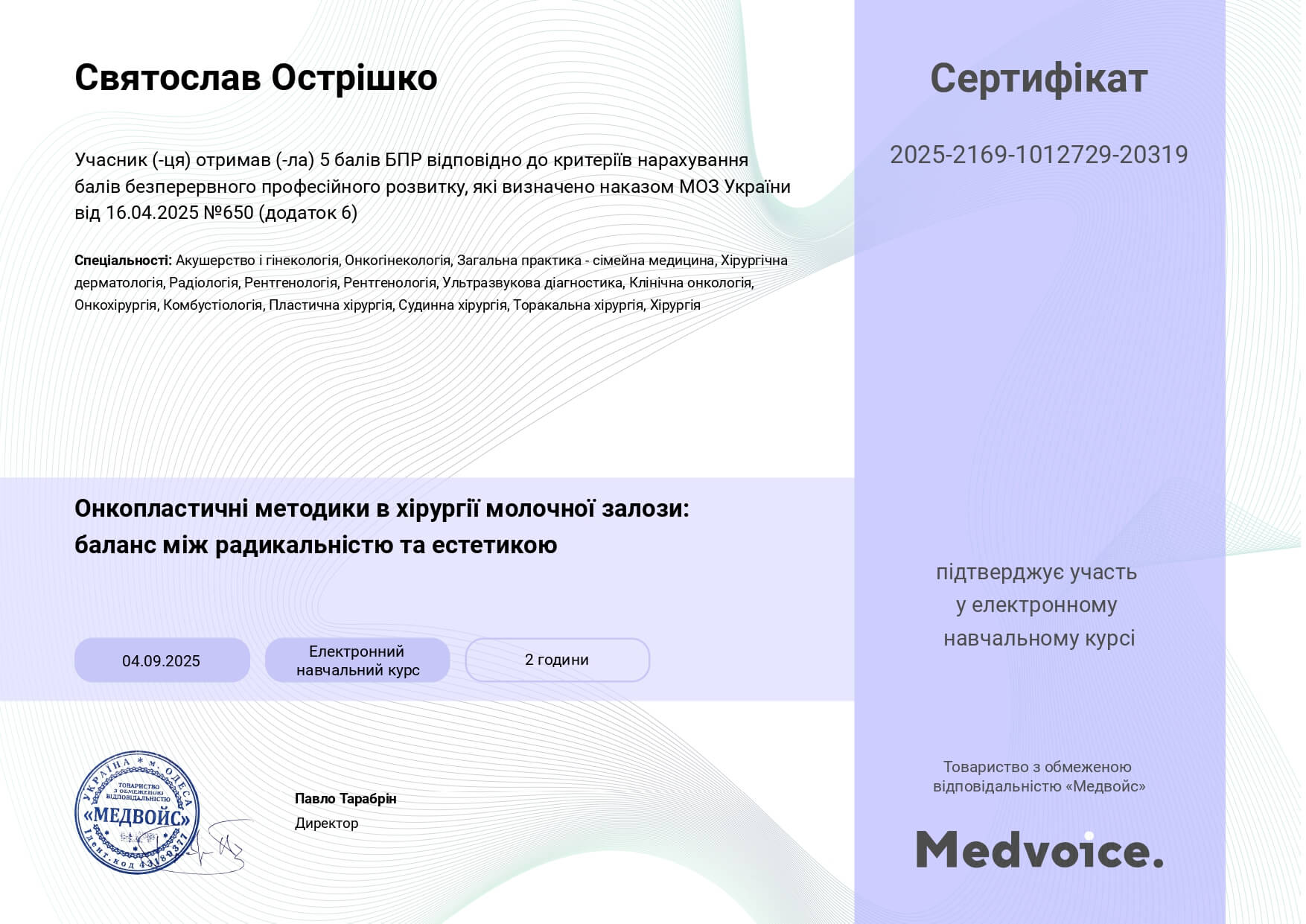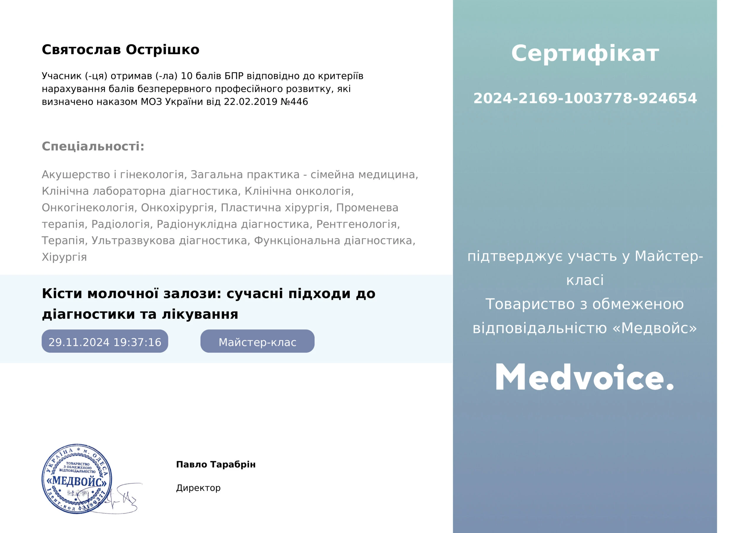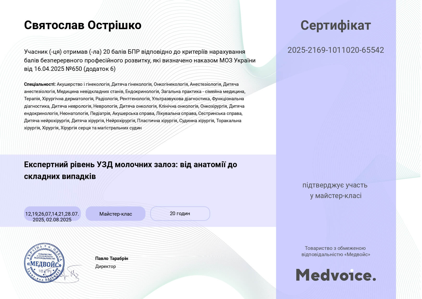 - Національна медична академія післядипломної освіти імені П.Л. Шупика, курси тематичного удосконалення «Амбулаторна проктологія», 2024
