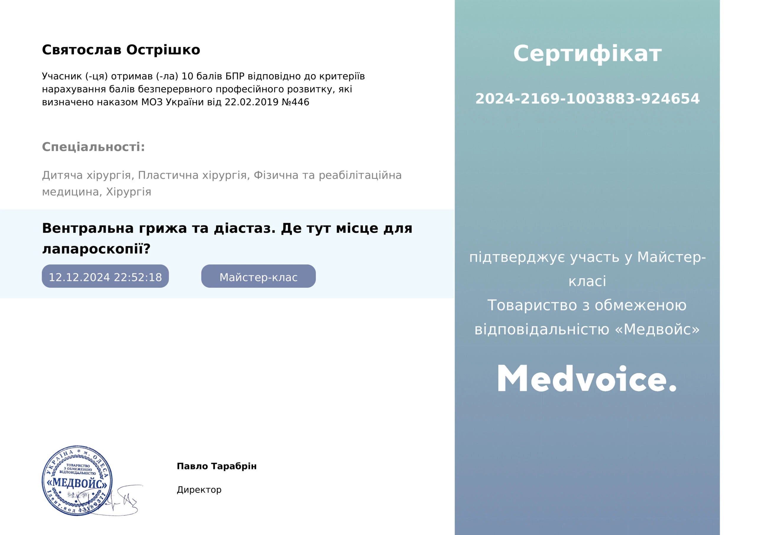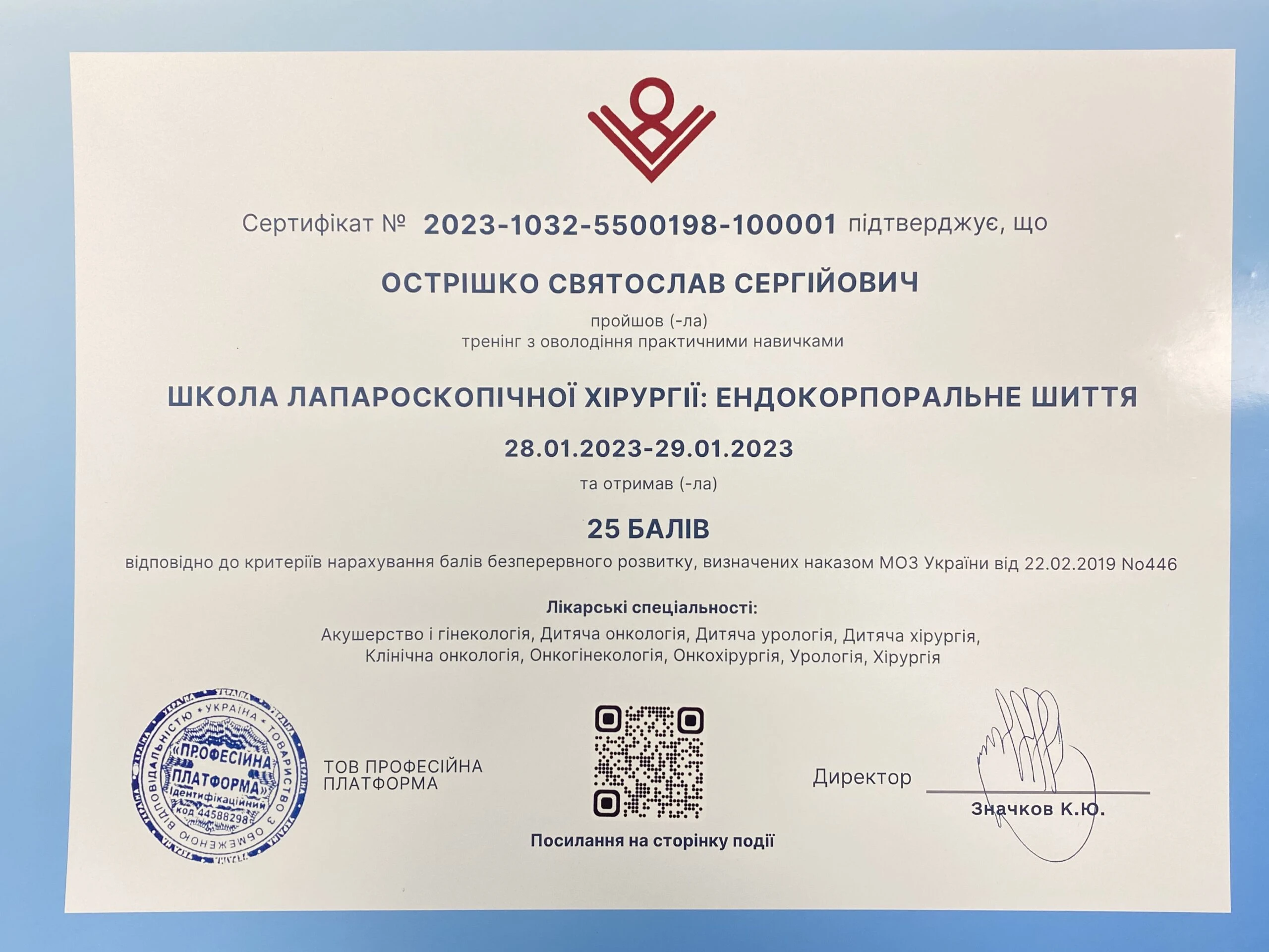 - Курс «Лапароскопічна хірургія», LapartSchool, 2022