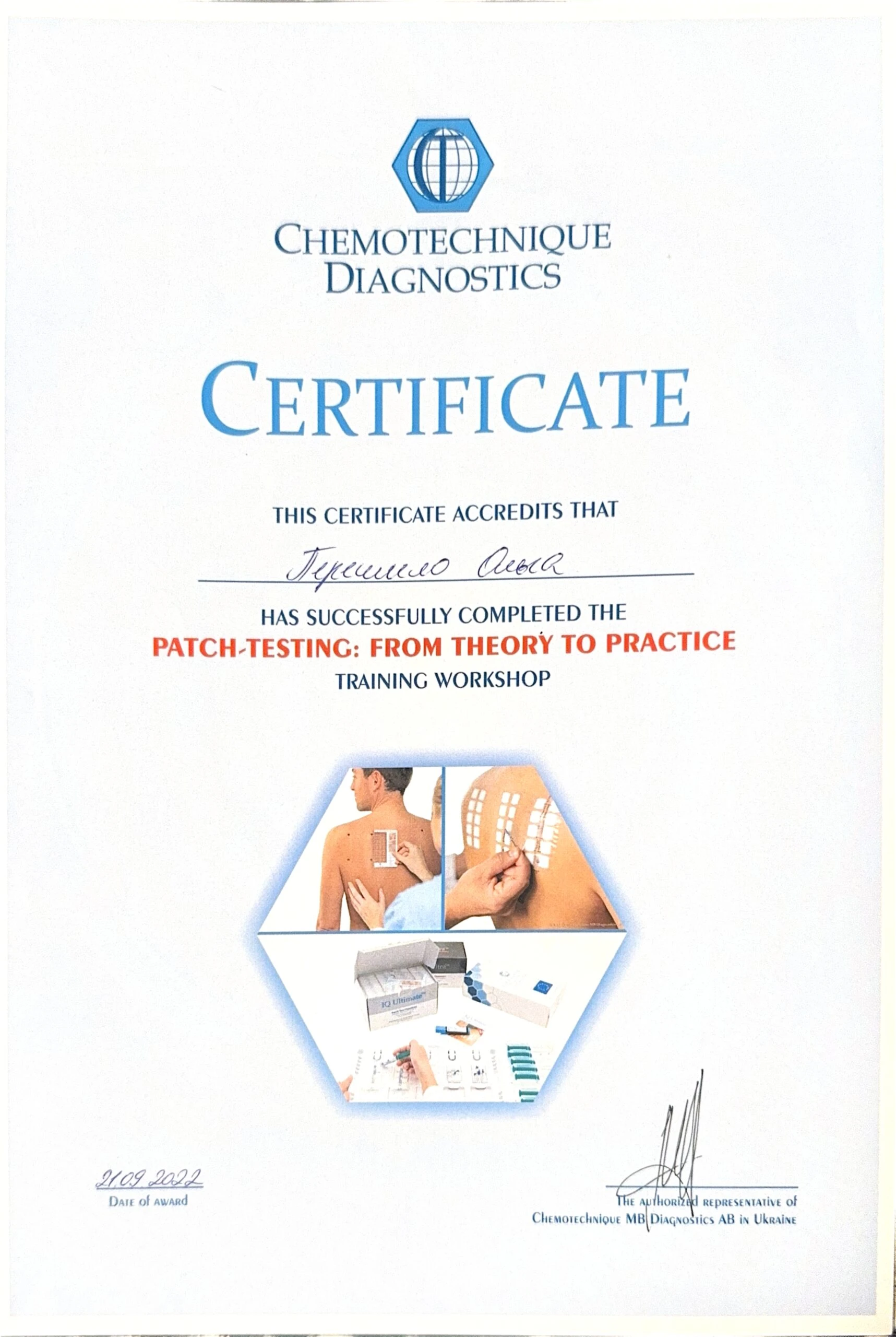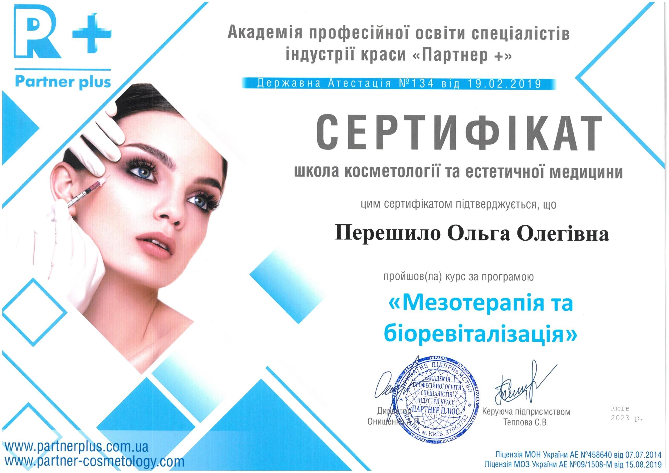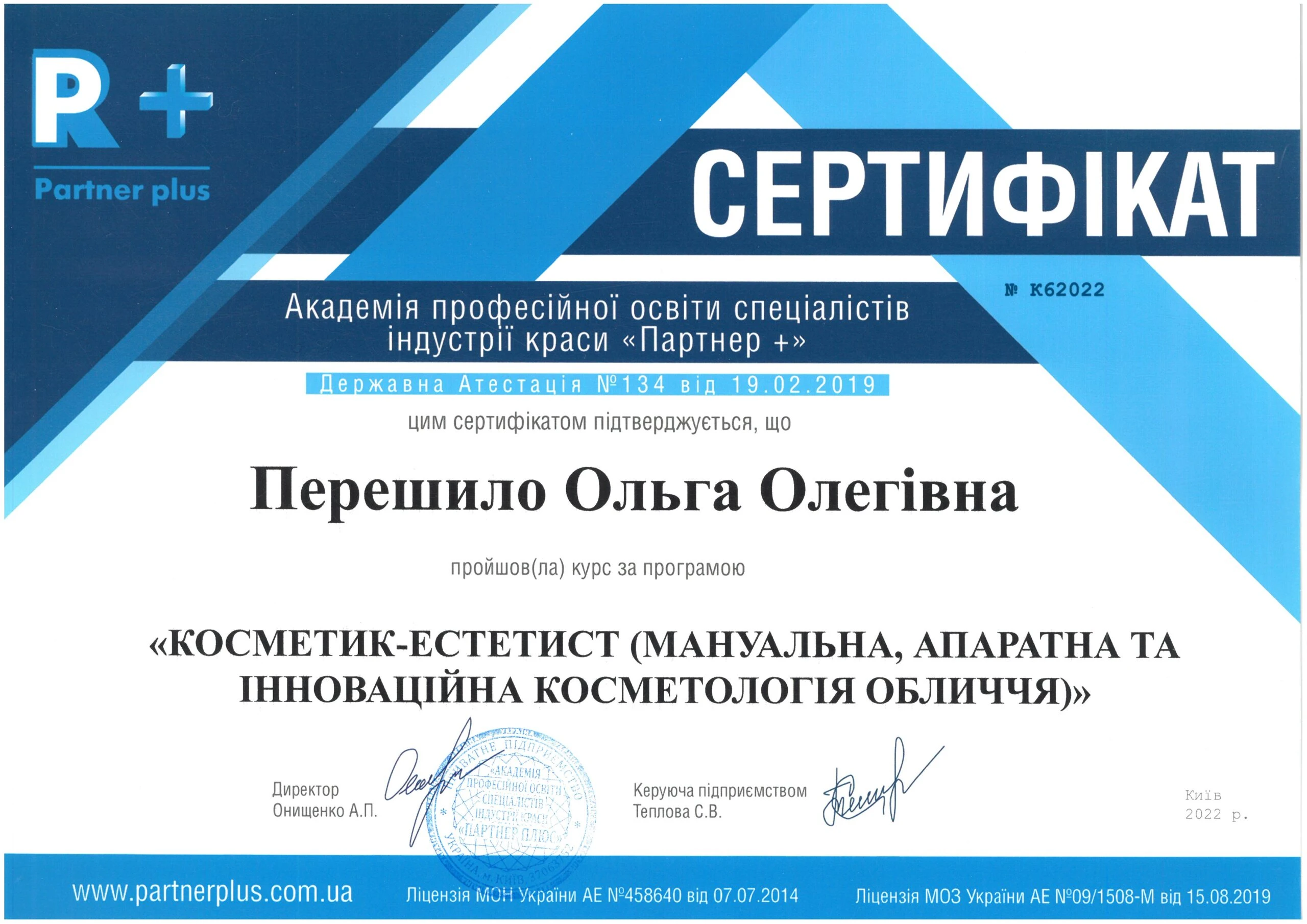• Косметик-естетист (мануальна, апаратна та інноваційна косметологія обличчя), ПП «Академія професійної освіти спеціалістів індустрії краси “Партнер Плюс”», 2022