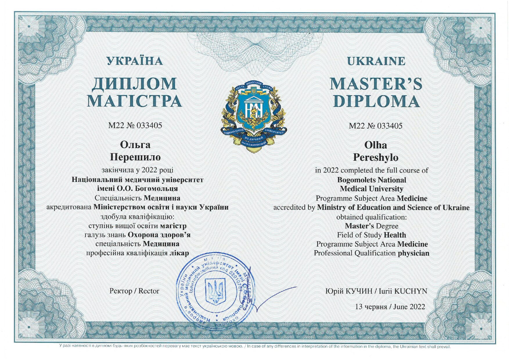 • Національний медичний університет імені О.О. Богомольця, «Медицина», 2022