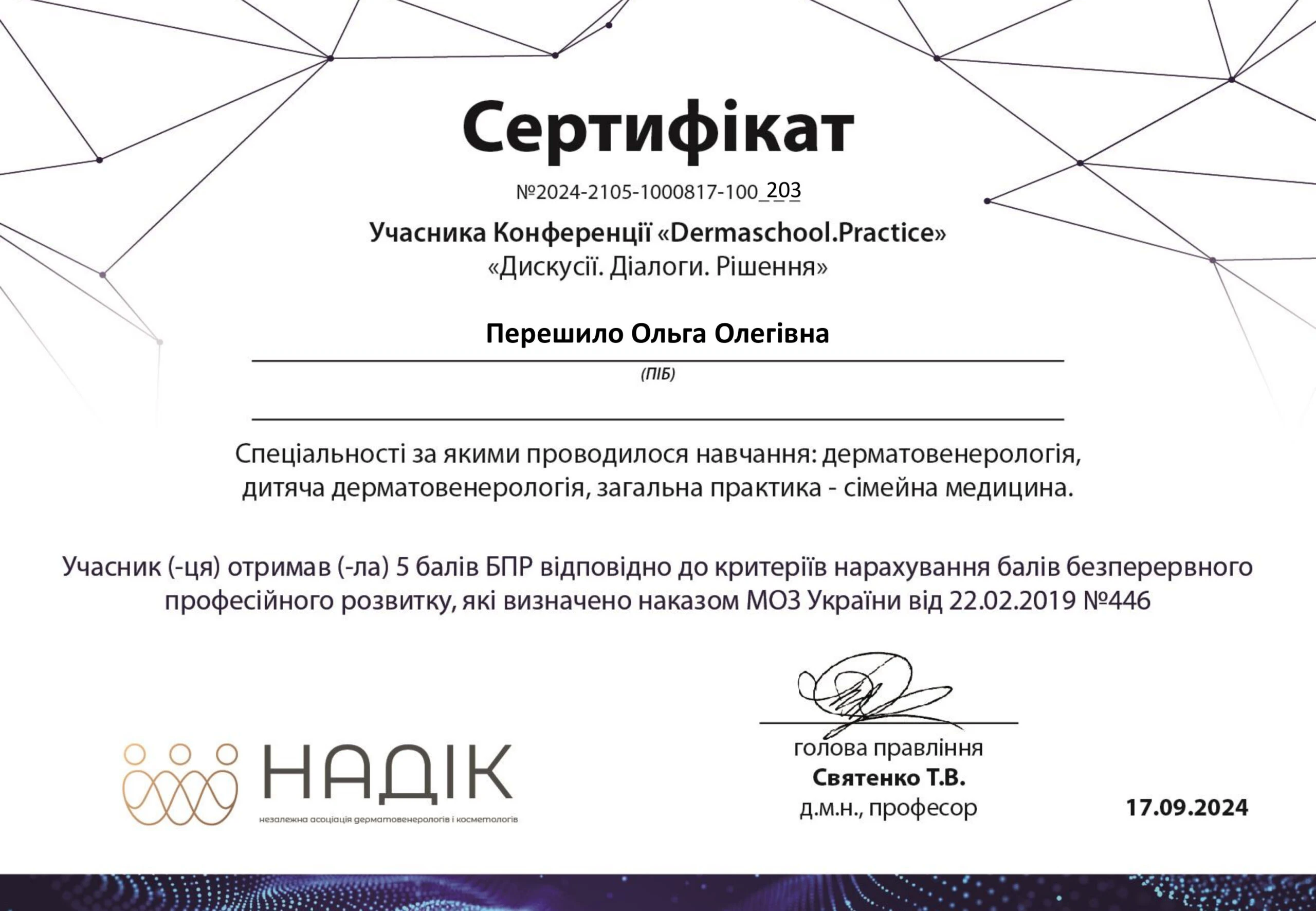 Дякую лікарю-дерматологу Перешило Ользі Олегівні за дбайливе, уважне ставлення до пацієнтів та чудові роз'яснення, щодо моїх запитань. Дізналася дуже багато корисної інформації, саме те що мені й було потрібно.
