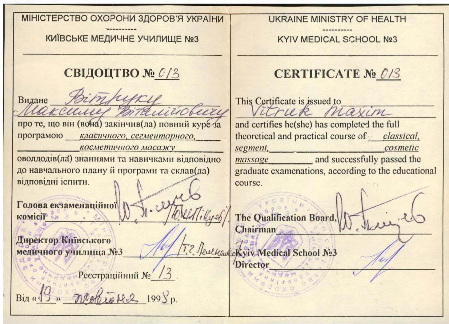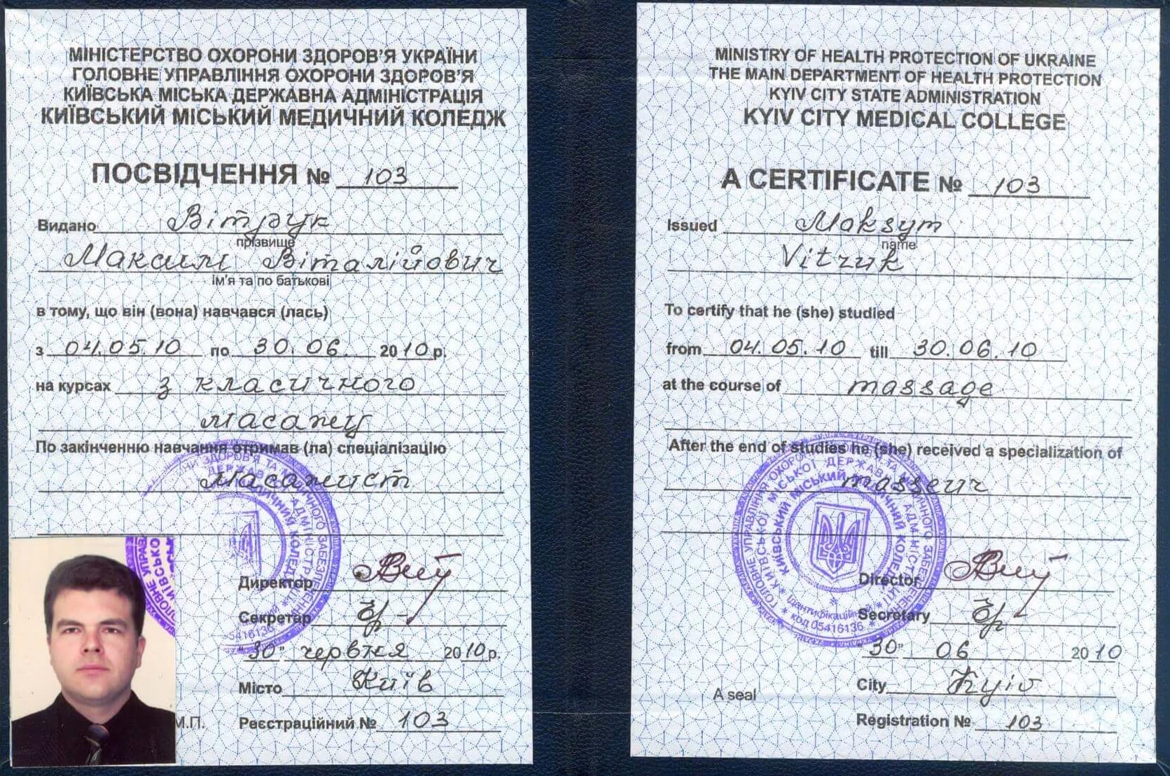 - Курси «Класичний та інші види масажу» на базі медичних училищ, 1998 та 2014