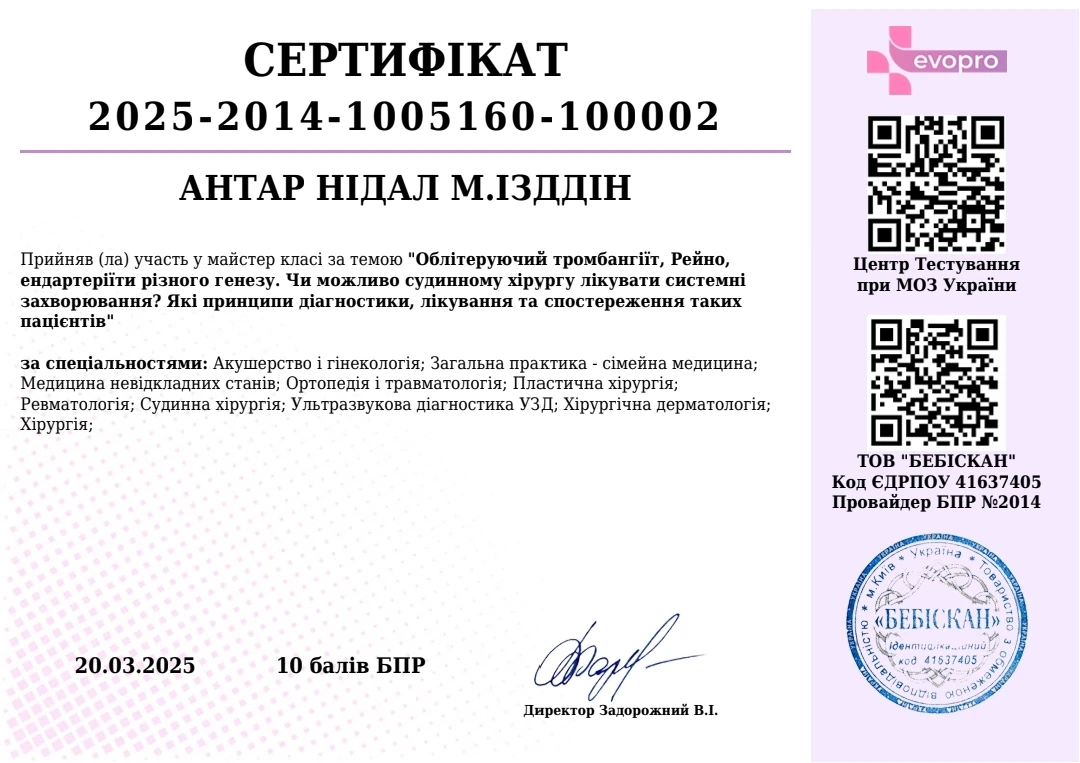 Нещодавно прооперувала дві кінцівки зразу, у судинного лікаря Антар Нідал М.Іздін. Результат відмінний, дай Боже вам здоров'я, щоб і надалі лікували людей.